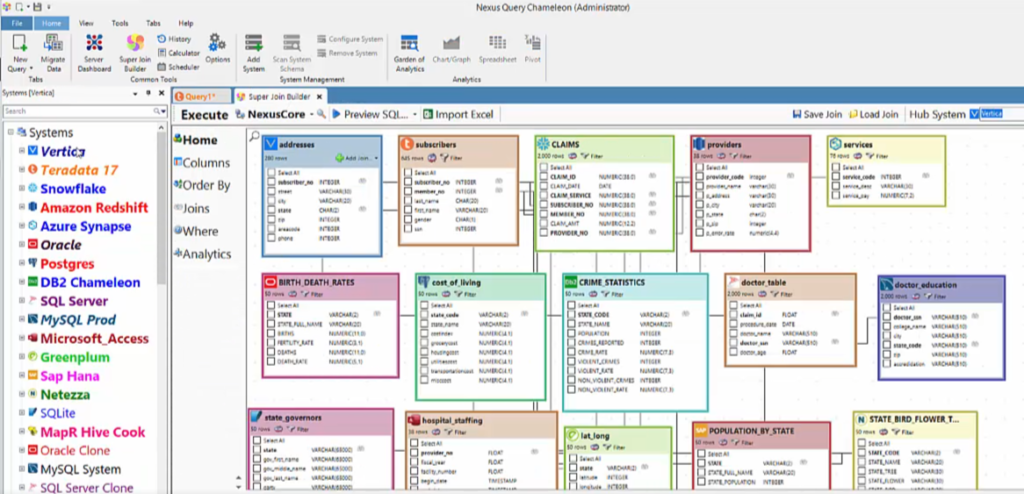 Most people have never imagined writing a two-table join where tables reside on different database platforms, called a federated query. However, federated queries are so easy that Nexus writes them for you.