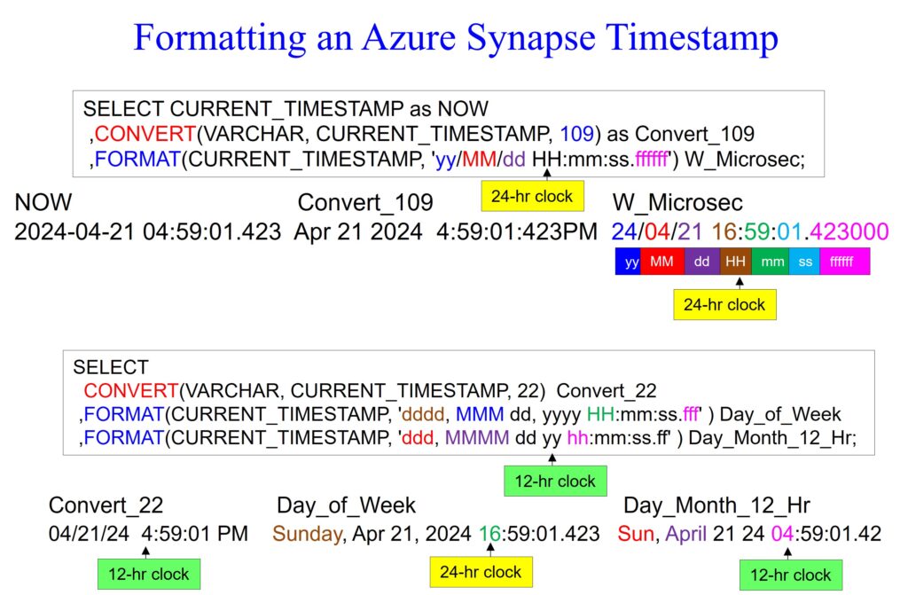 Below are some great examples for formatting an Azure Synapse timestamp to get you a great start to understanding how to use the CONVERT and FORMAT commands. Below is a breakdown of components of the FORMAT command.
