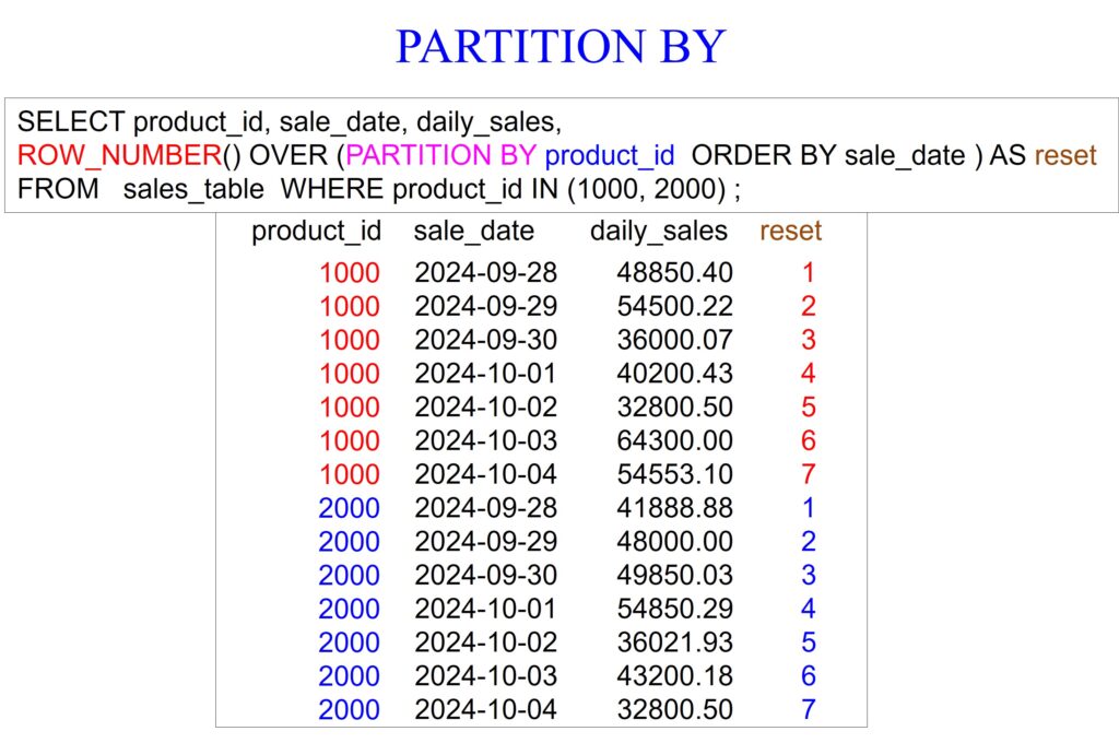 Notice that we partition by product_id and use the ORDER BY sale_date DESC to guarantee that the last sale_date for each product_id receives a row_number of one.
