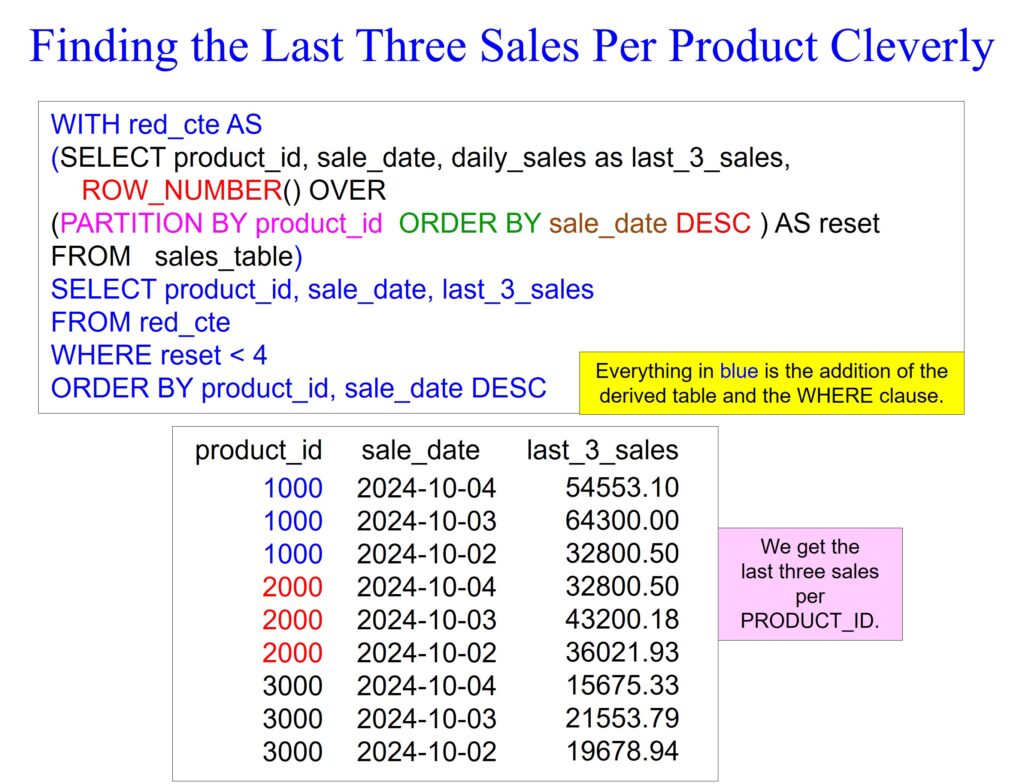 Our example returns the last three sales per product_id, demonstrating the power of a derived table. A WHERE clause filters before calculations or analytics run, so we place our query inside parenthesis to create a derived table. I have placed everything you need to create a derived table and query it with a WHERE clause in blue.