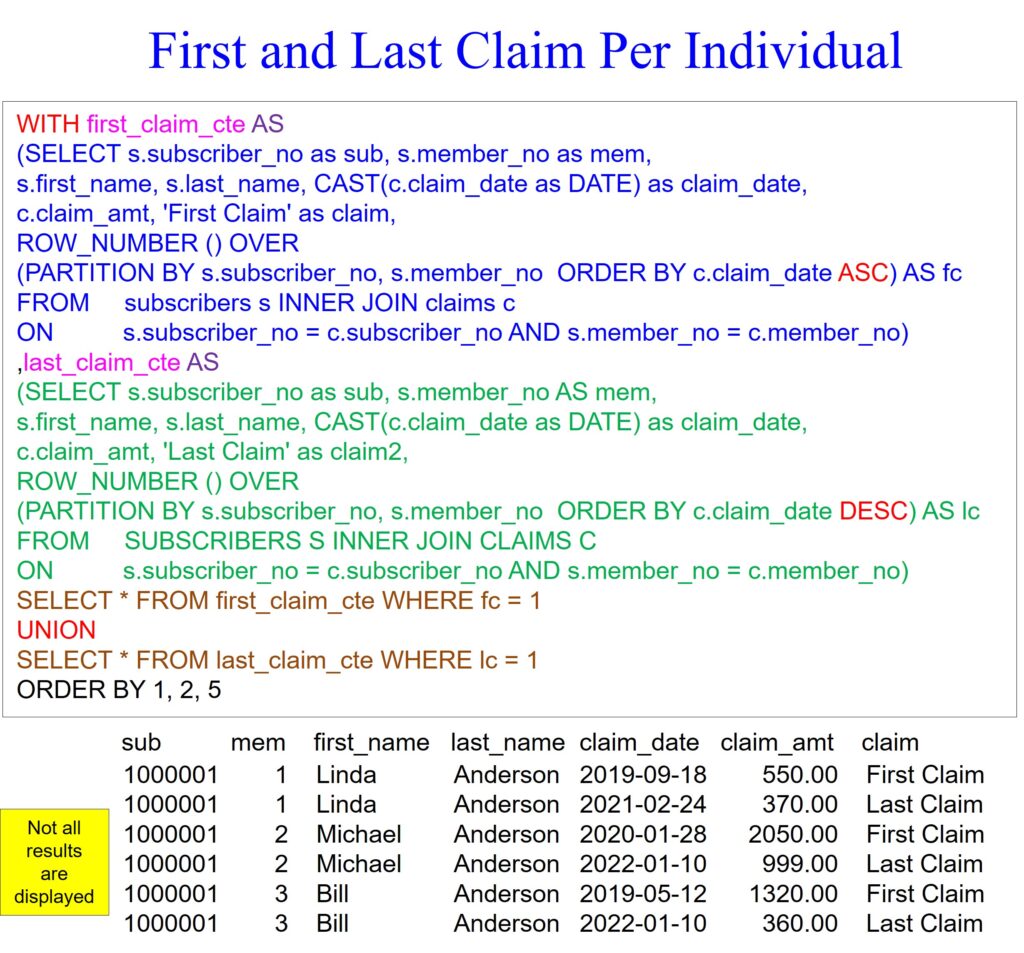 The example below uses clever techniques to find the first and last claim filed per individual. We have created two derived tables using the WITH technique to accomplish the request. Notice the keyword WITH is only used once, but I have the names of both derived tables colored in pink. I have also colored the first derived table blue and the second green.