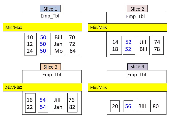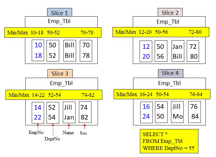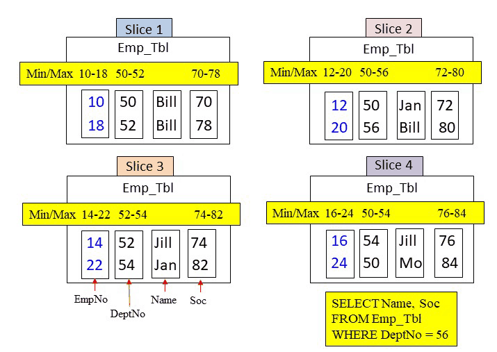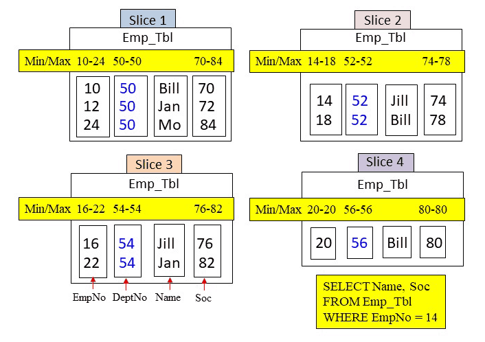 Below, the metadata for EmpNo shows that only two blocks fall in the min/max range of 14. Those two blocks (residing on slices 1 and 2) are read into memory. Then, the system learns that only slice 2 has an EmpNo value = 14. Slice two then places it’s Name and Soc blocks into memory. One row is returned, but four blocks needed to be read into memory.