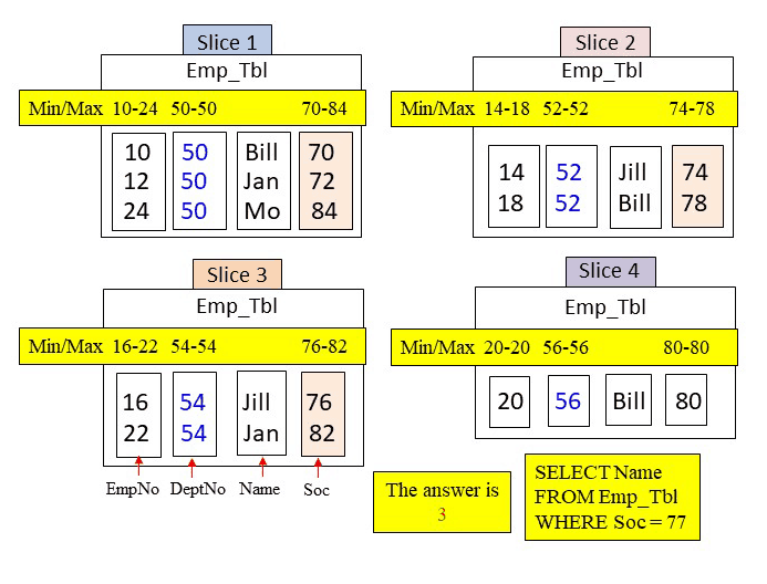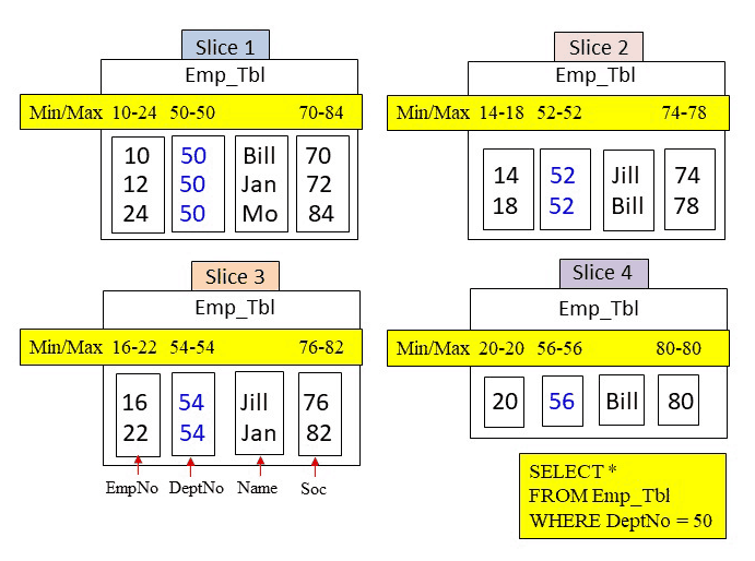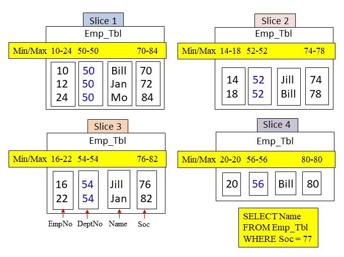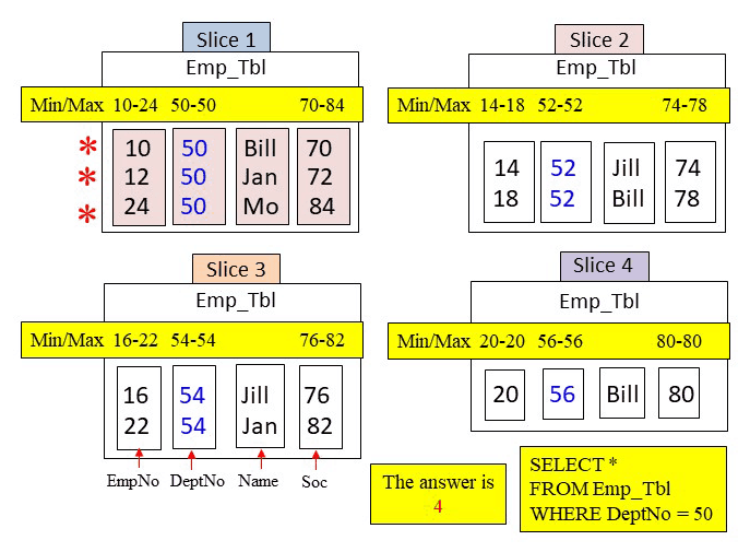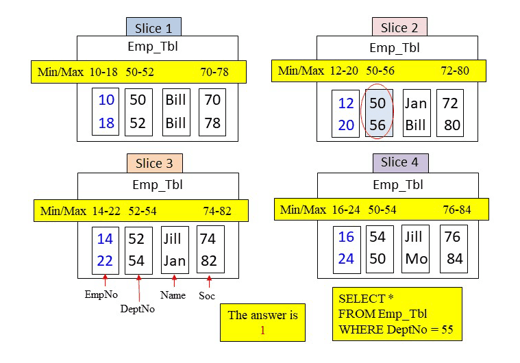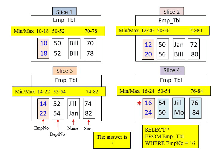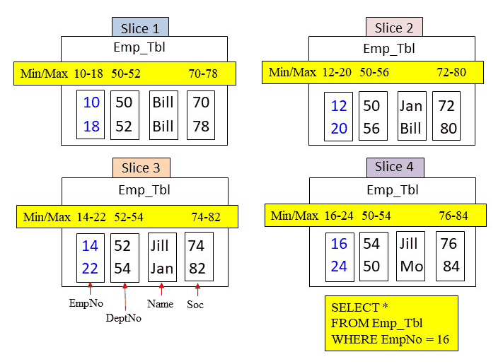 The WHERE clause is looking for an EmpNo = 16. The metadata for EmpNo shows that all EmpNo blocks falls in the min/max range of 16. Therefore, each EmpNo block from each slice must be read into memory. There are four blocks placed into memory for the first check only. Then, after each slice places their EmpNo block in memory only slice 4 found a match. Slice four then places its DeptNo, Name, and Soc blocks into memory to satisfy the query. One row is returned.