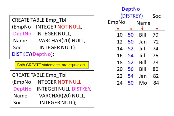 Below, a table named Emp_Tbl has been created with a DISTKEY on the column DeptNo. Also listed below are the eight rows of the table.
