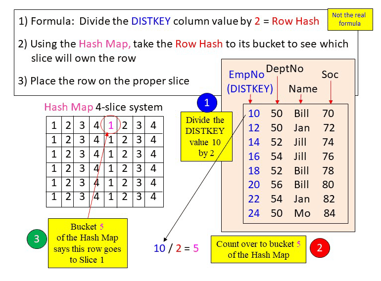 The first technique you need to understand is that almost all Massively Parallel Processing (MPP) databases use a math formula called a Hash Formula to spread the data among the slices. Notice that the data spread evenly across the slices. This is because there were no duplicate EmpNo values.