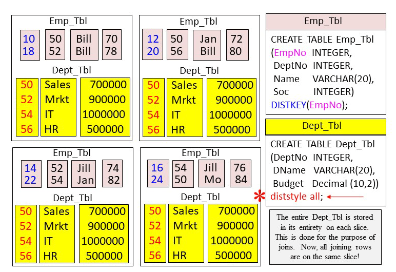 In the example below, to get the matching rows on the same slice Amazon Redshift must redistribute the Emp_Tbl by DeptNo instead of its current DISTKEY of EmpNo. This is only done in memory and the redistribution only lasts for the life of this join. This is what you want to avoid. Your design goal is to make sure no data needs redistributed on joins!