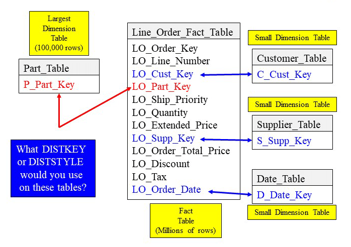 The fact table (Line_Order_Fact_Table) is the largest table, but the Part_Table is the largest dimension table. That is why you make Part_Key the distribution key for both tables. Now, when these two tables are joined together, the matching Part_Key rows are already on the same slice. You can then distribute by ALL on the other dimension tables. Each of these tables will have all their rows on each slice. Now, everything that joins to the fact table is co-located!