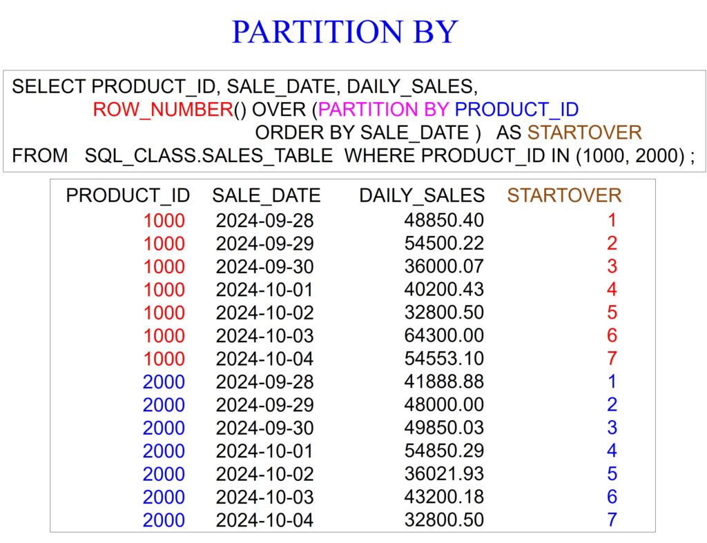 Our next example uses a PARTITION BY statement, which means performing the analytic within each product_id separately. I like to think of it as resetting the row_number with the beginning of each product_id. Notice that we are ordering the data by sale_date, but it appears we are ordering by product_id and then sale_date because of the combination of partitioning and ordering within the row_number analytic.