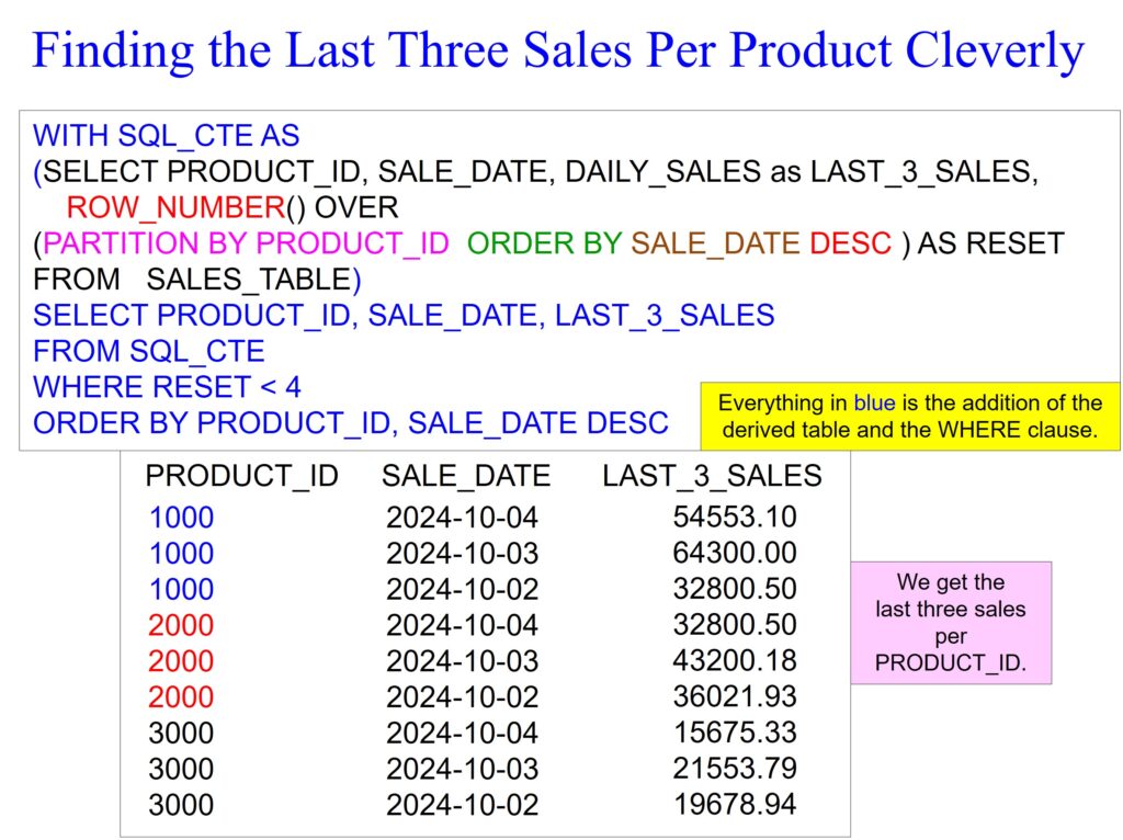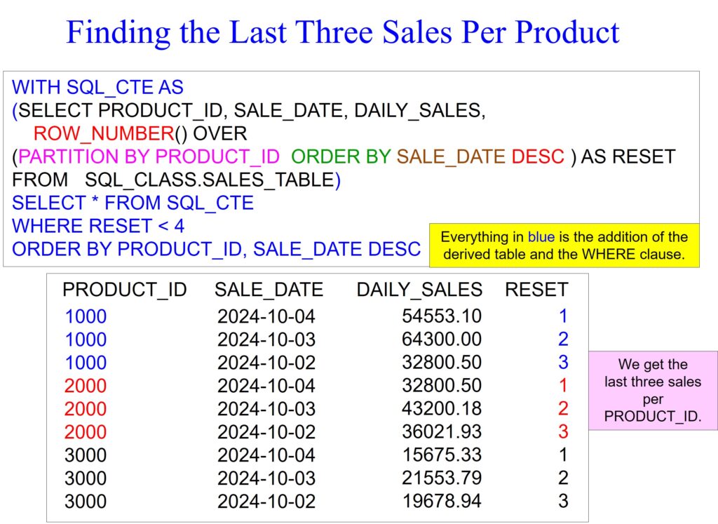 Our example returns the last three sales per product_id, demonstrating the power of a derived table. A WHERE clause filters before calculations or analytics run, so we place our query inside parenthesis to create a derived table. I have placed everything you need to create a derived table and query it with a WHERE clause in blue.