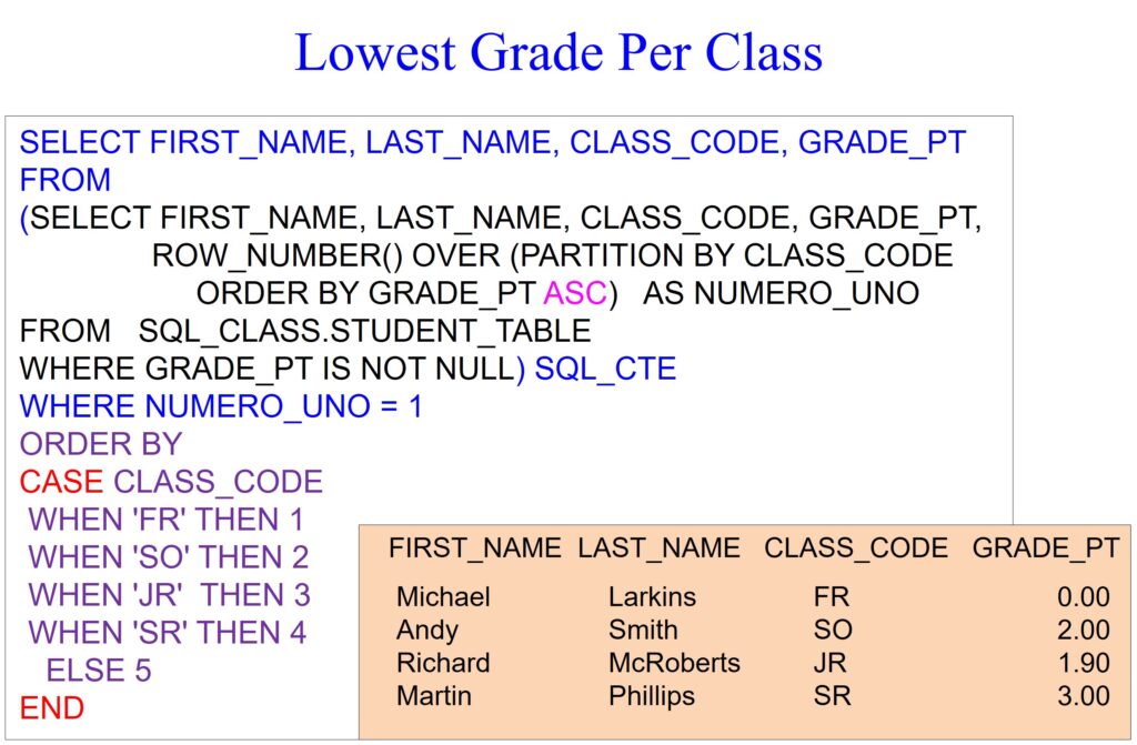 We have made a few changes in our example below to return the lowest grade averages per class_code. The most important detail is that we are now ordering the data by grade_pt in ascending mode. We place our row_number query inside a derived table I have colored in blue. We can then use a WHERE clause to filter out rows that do not receive a row_number of one. We only select columns we want on the final report in our top SELECT statement without selecting the row_number on the report. I have also done a final ORDER BY using a CASE statement to order the answer set logically instead of alphabetically.