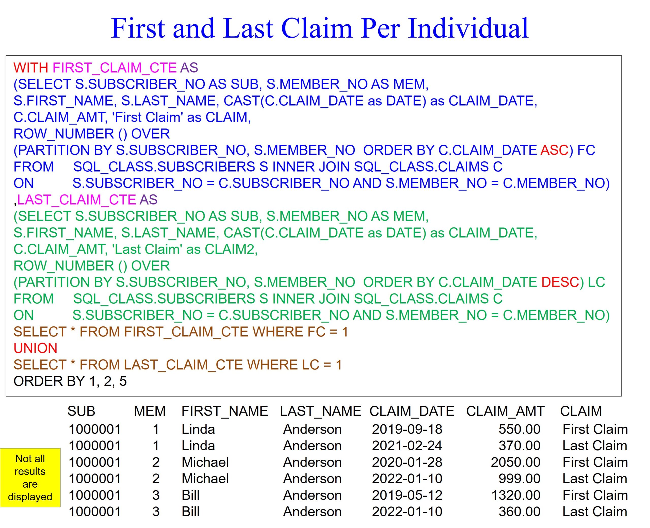 The example below uses clever techniques to find the first and last claim filed per individual. We have created two derived tables using the WITH technique to accomplish the request. Notice the keyword WITH is only used once, but I have the names of both derived tables colored in pink. I have also colored the first derived table blue and the second green.