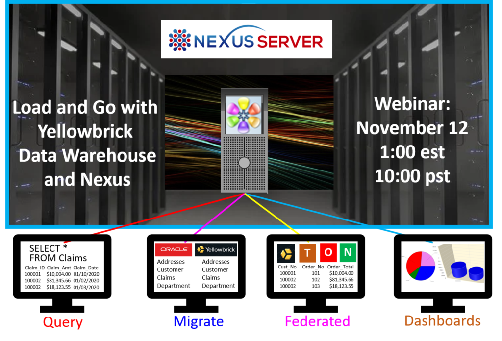 Today you will witness moving and joining data across every platform in your enterprise faster than magic. The Nexus Desktop with a Nexus Server puts the business user on the same playing field as the data scientist. Combine Nexus with Yellowbrick and you get the greatest hybrid-cloud strategy on today’s market. Watch a billion-row table query in one second. Watch joins across all platforms, and watch how easy everyone from the business user to the ETL teams migrate with a button click.
