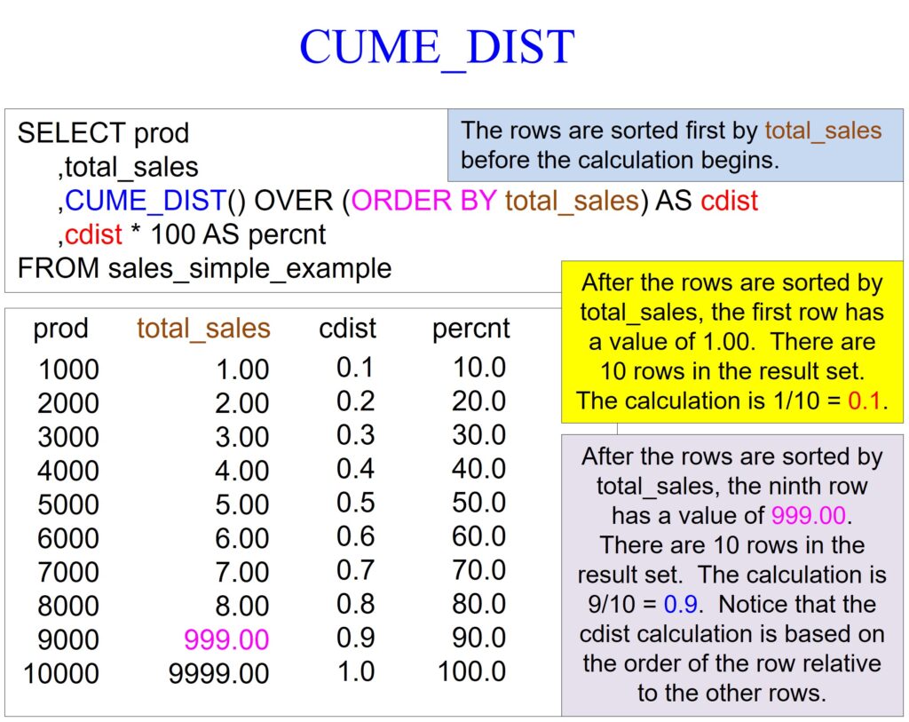 The CUME_DIST function is an SQL analytic window function that calculates the cumulative distribution of a value within a group of values. CUME_DIST provides a straightforward way of analyzing sales distribution across different products.