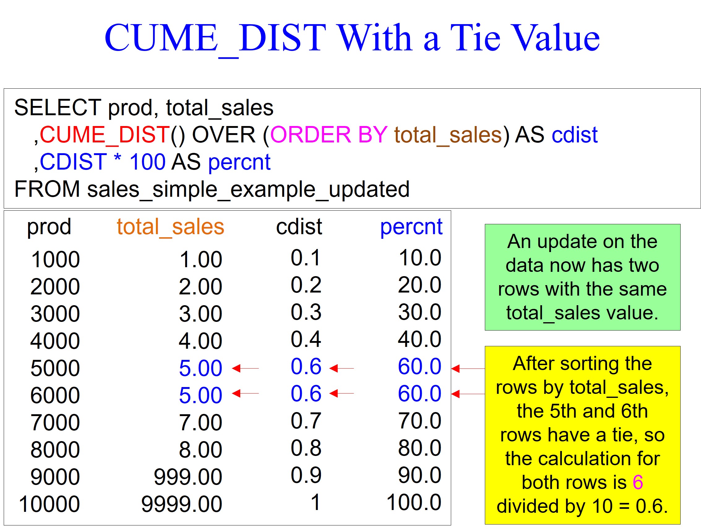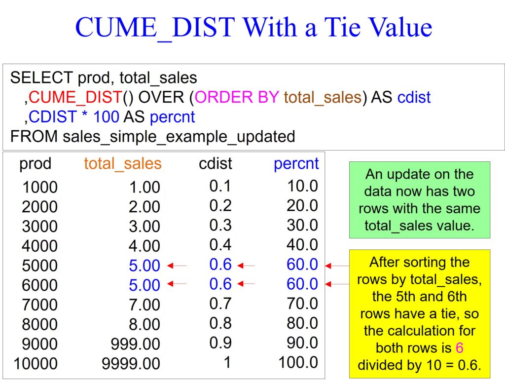 You will always have the keyword OVER, meaning the system will perform the CUME_DIST function on an ordered set of values. So before the CUME_DIST function is performed, the system will use the ORDER BY total_sales statement to sort the rows by total_sales. The default of an ORDER BY is ascending mode, which is how the data is sorted.