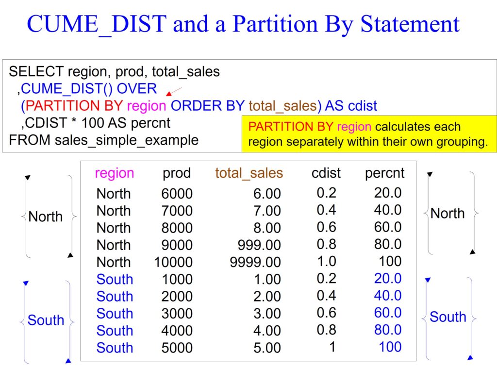 In the example below, we use the PARTITION BY command in column REGION. Since there are two regions, North and South, the CUME_DIST will calculate for only the North region and then reset and calculate the South region.