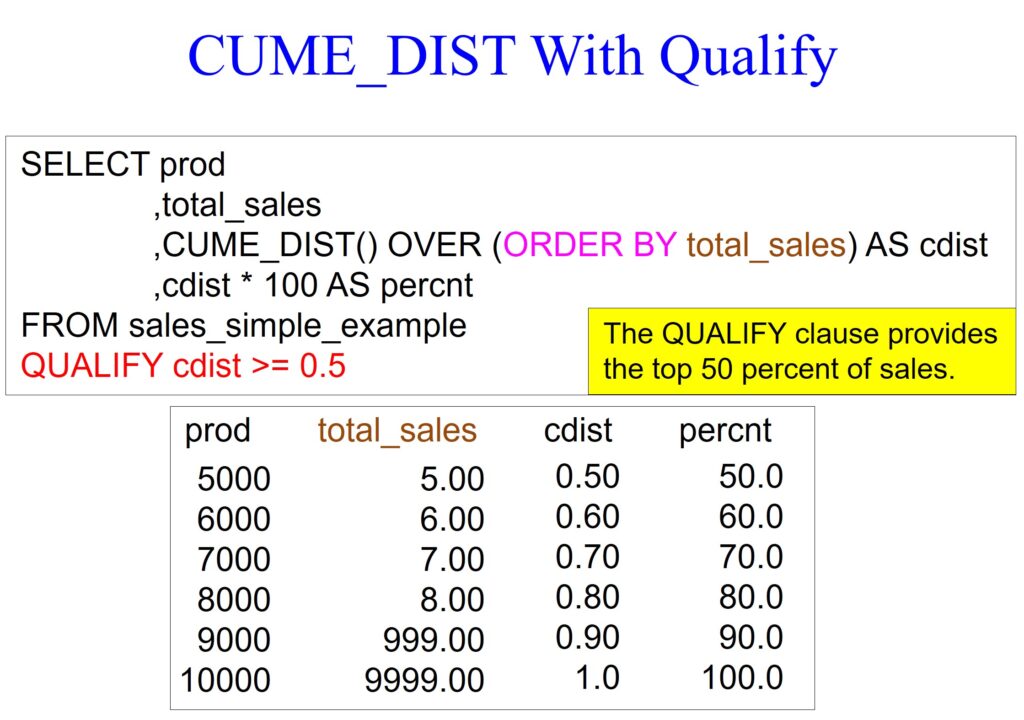 In our example below, we use the QUALIFY statement to return only rows in the top 50 percent of sales. You will only see the QUALIFY statement in Snowflake, Databricks, BigQuery, and Teradata.