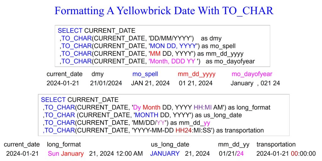 Would you like to format dates on a Yellowbrick system? Yellowbrick uses the TO_CHAR command to transform raw date or timestamp data to your desired format. This blog will brilliantly break down and explain everything about formatting a Yellowbrick date so you can choose what works best for you.