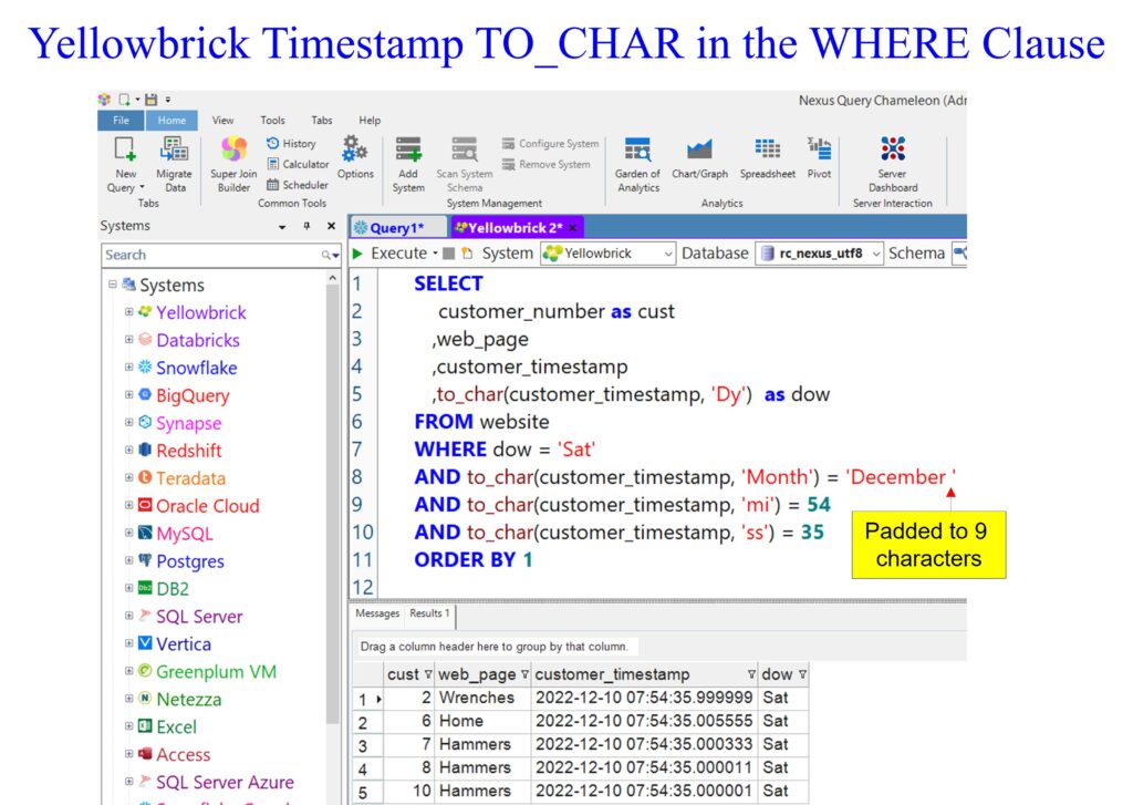 I bet you didn’t know you could use the TO_CHAR function in the WHERE and AND clauses to filter rows. The query below only returns rows where the customer_timestamp has a month of December, a day of Saturday, a minute of 54, and a second of 35. Also notice we use the alias dow in the SELECT list and again in the WHERE clause.