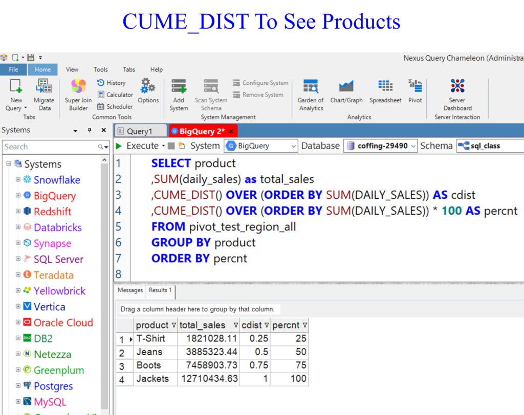 Below is a query that performs a sum of the daily_sales, which we alias total_sales. We then perform a CUME_DIST on the total_sales. Jackets are performing quite well, and T-shirts are our worst performers.