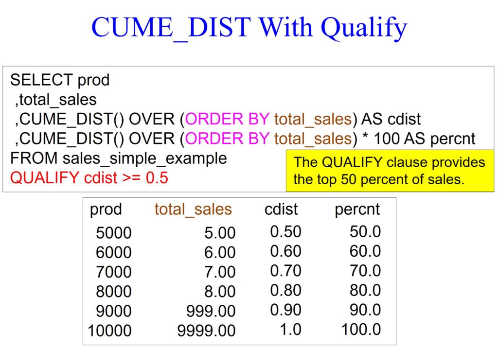 You will always have the keyword OVER, meaning the system will perform the CUME_DIST function on an ordered set of values. So before the CUME_DIST function is performed, the system will use the ORDER BY total_sales statement to sort the rows by total_sales. The default of an ORDER BY is ascending mode, which is how the data is sorted.