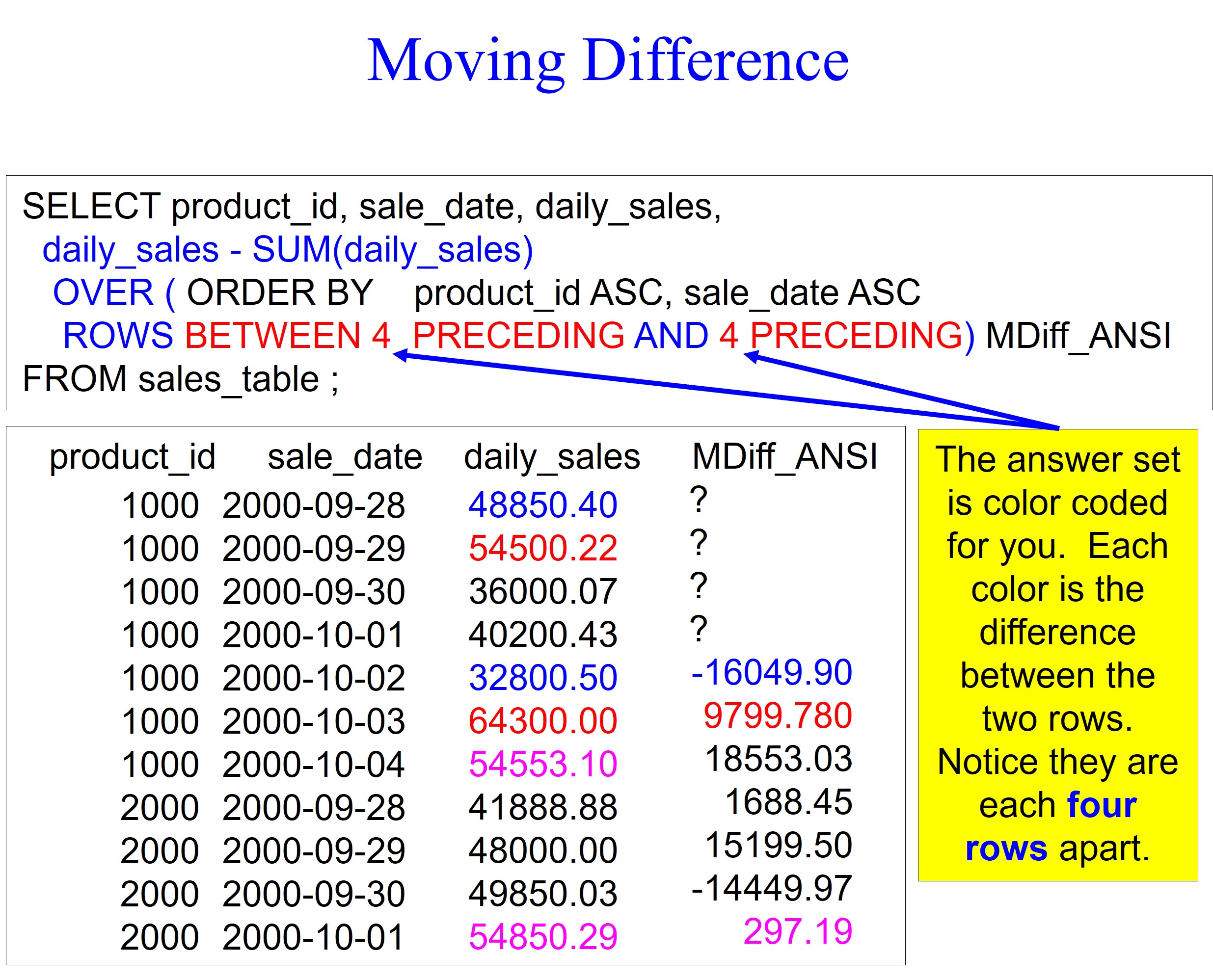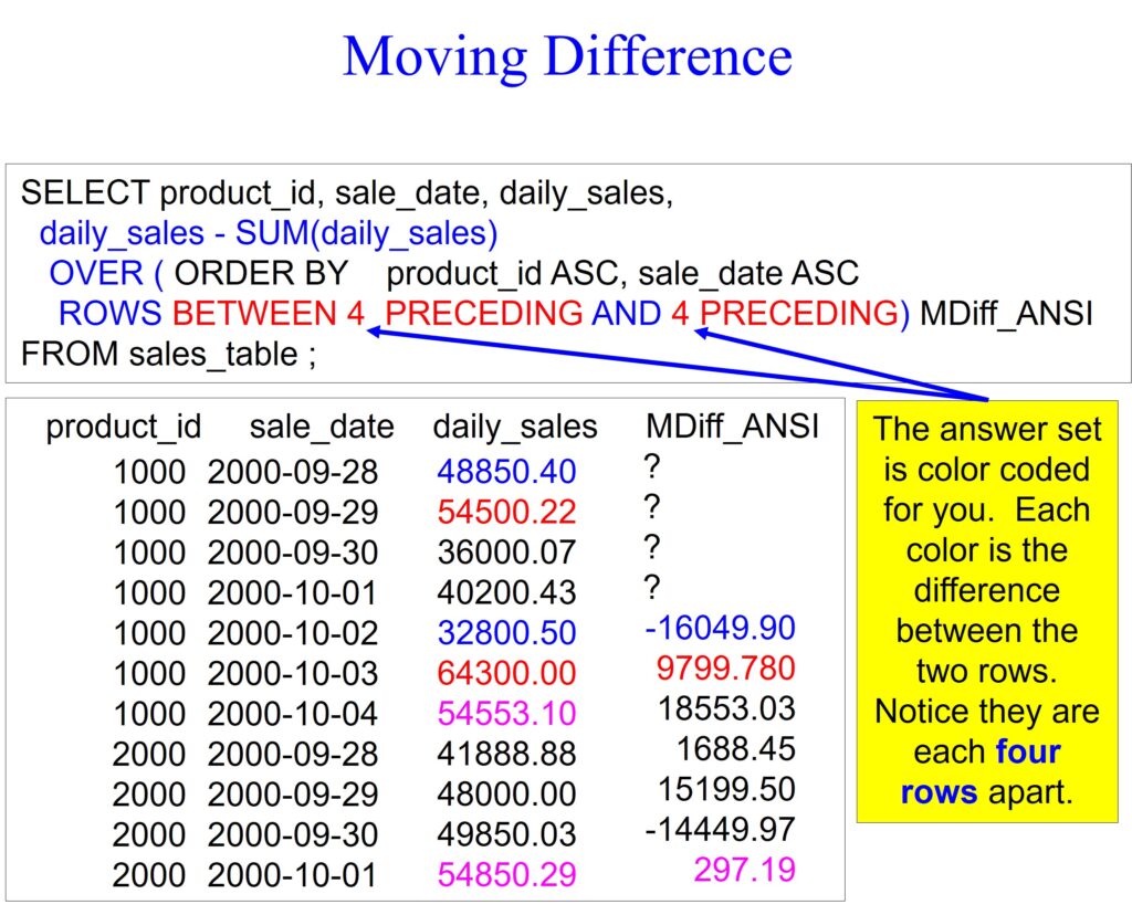 Notice that the fifth row has a value of -16409.90. We are only comparing the daily_sales value in row one with the daily_sales value in row five because we have a moving window of four because of the keywords ROWS BETWEEN 4 PRECEDING AND 4 PRECEDING. I have colored those values in blue. Notice that we compared row two with row six (four rows apart), and we did better by 9,799.78 dollars, colored in red.
