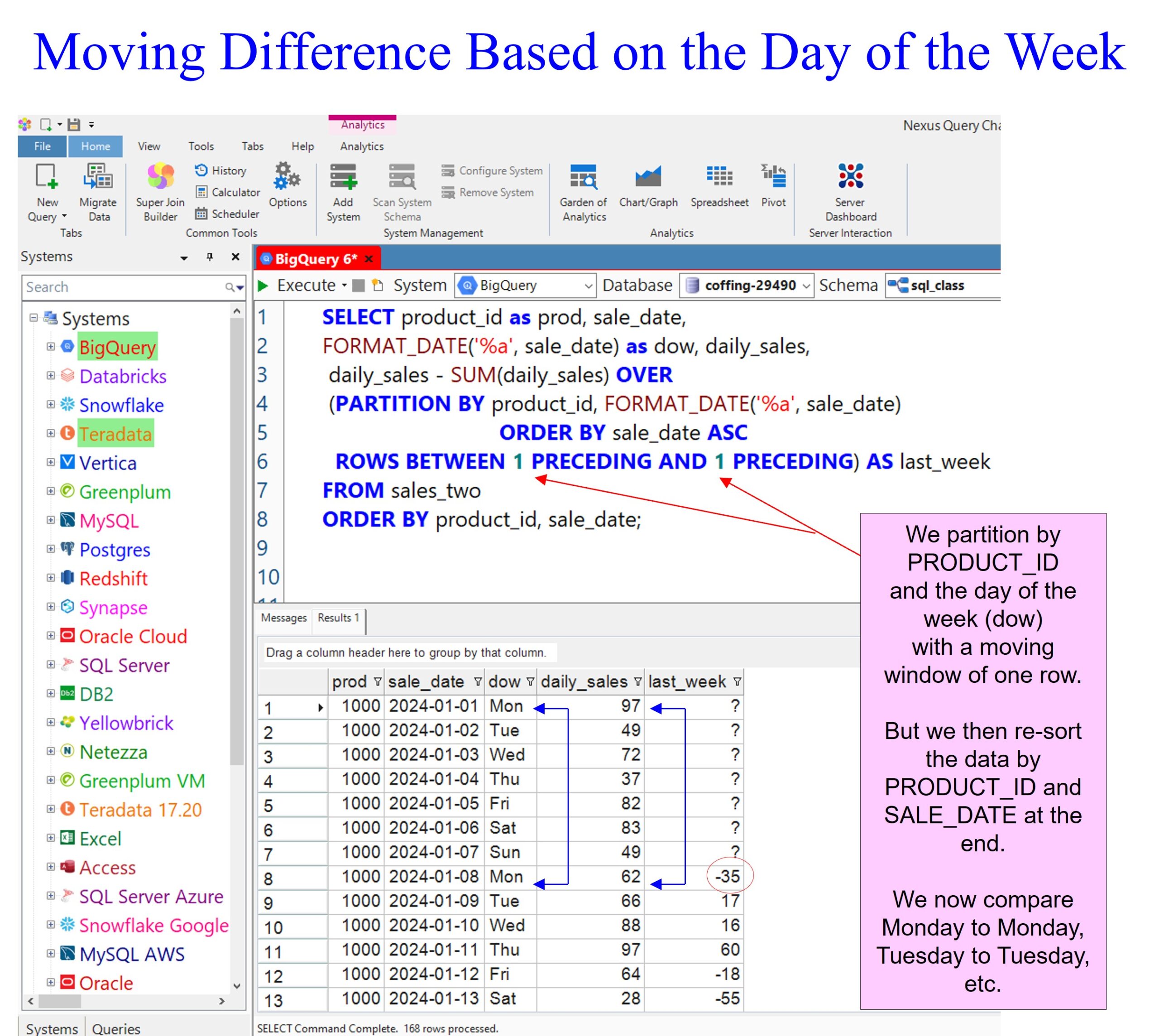 I use several tricks to ensure that this is perfect. The first trick is using the FORMAT_DATE command to format the sale_date to provide the day of the week, which I alias as dow. I then PARTITION BY product_id and again use the FORMAT_DATE command as a partition to calculate the data by PRODUCT_ID 1000, and then all of my Mondays, which are now back to back. These are followed by all of my Tuesdays in a row. I then use a moving window of one because of the keywords ROWS BETWEEN 1 PRECEDING and 1 PRECEDING.