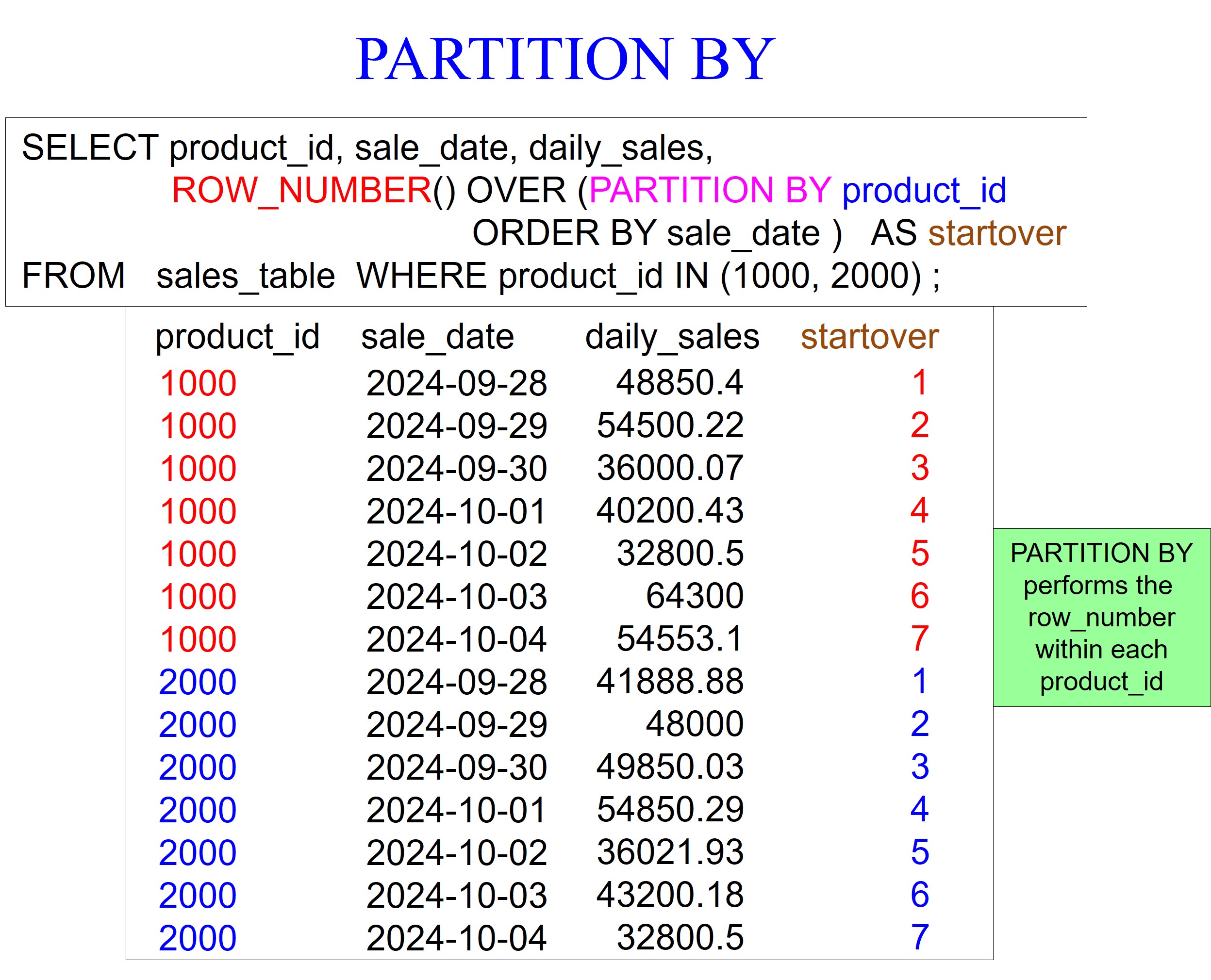 Our next example uses a PARTITION BY statement, which means performing the analytic within each product_id separately. I like to think of it as resetting the row_number with the beginning of each product_id. Notice that we are ordering the data by sale_date, but it appears we are ordering by product_id and then sale_date because of the combination of partitioning and ordering within the row_number analytic.