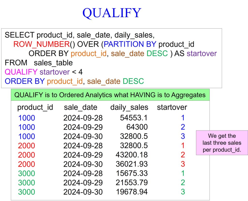 Our example returns the last three sales per product_id, demonstrating the QUALIFY statement’s power. Qualify filters like a WHERE clause, but there is a big difference. A WHERE clause removes rows before a calculation, so the data must exist inside the table. However, a QUALIFY statement filters after the analytic runs. QUALIFY is to analytics what HAVING is to aggregation.