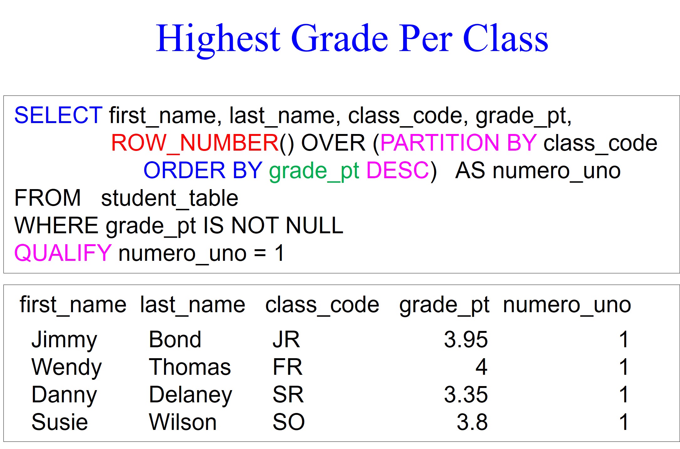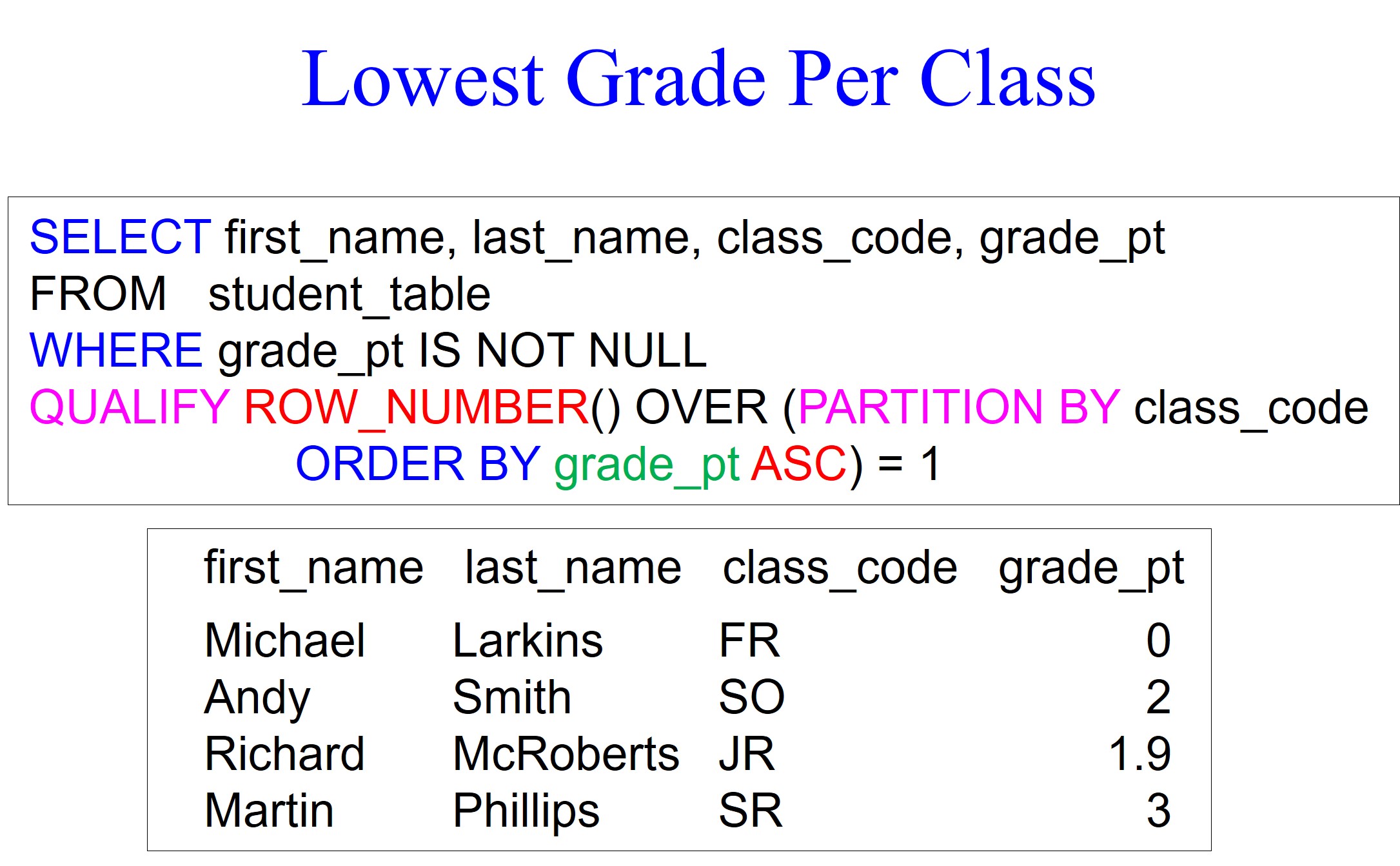 We have made a few changes in our example below to return the lowest grade averages per class_code. We use the qualify statement at the bottom of the query, which partitions by class_code and then orders by grade_pt in ascending order. We get the lowest grade averages per class_code, but without seeing the row_number on the report.