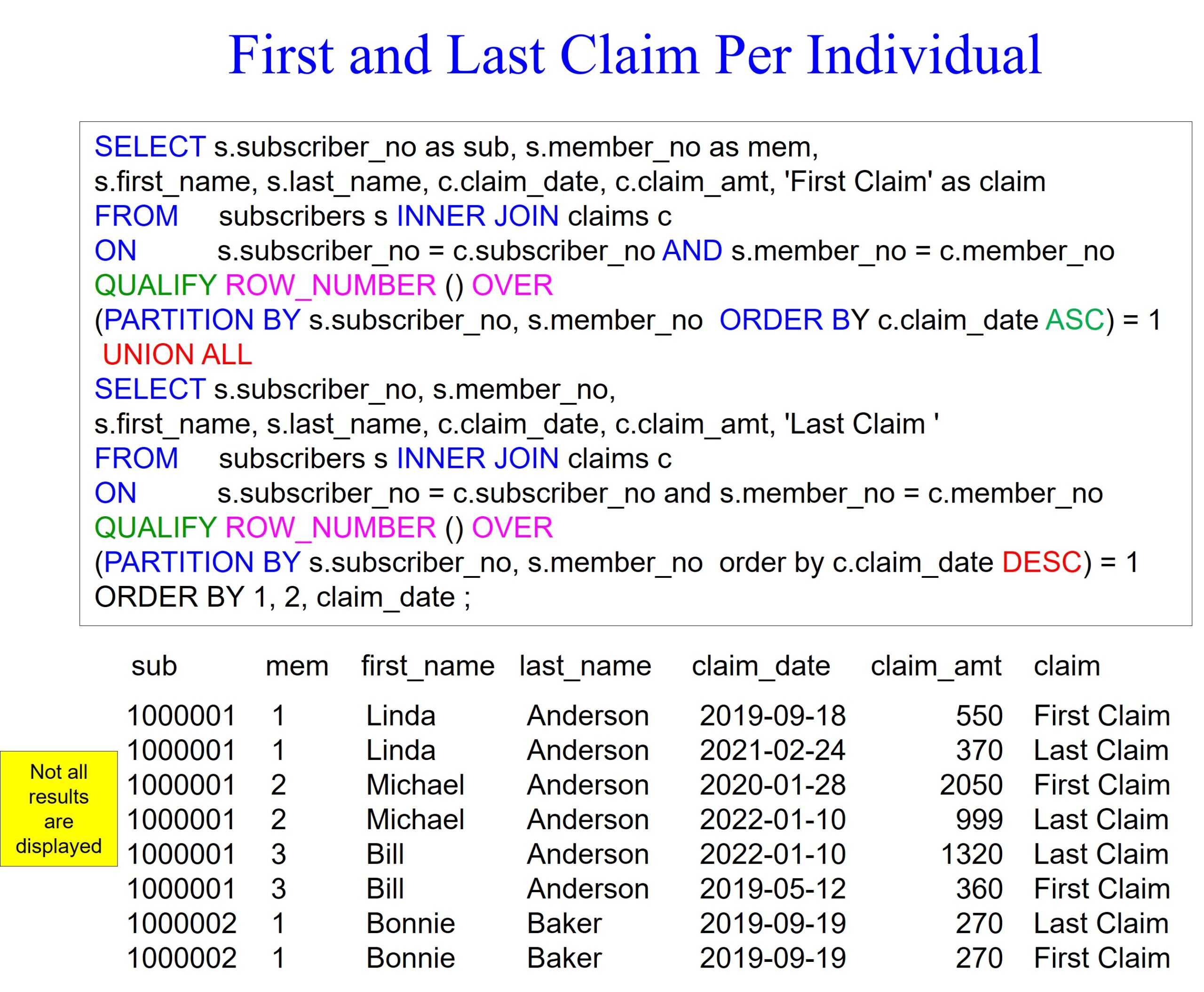 The example below uses clever techniques to find the first and last claim filed per individual. The first thing to focus on is the UNION set operator. A set operator will have two select statements, each with the same amount of columns and similar data types, often referred to as being from the same domain.