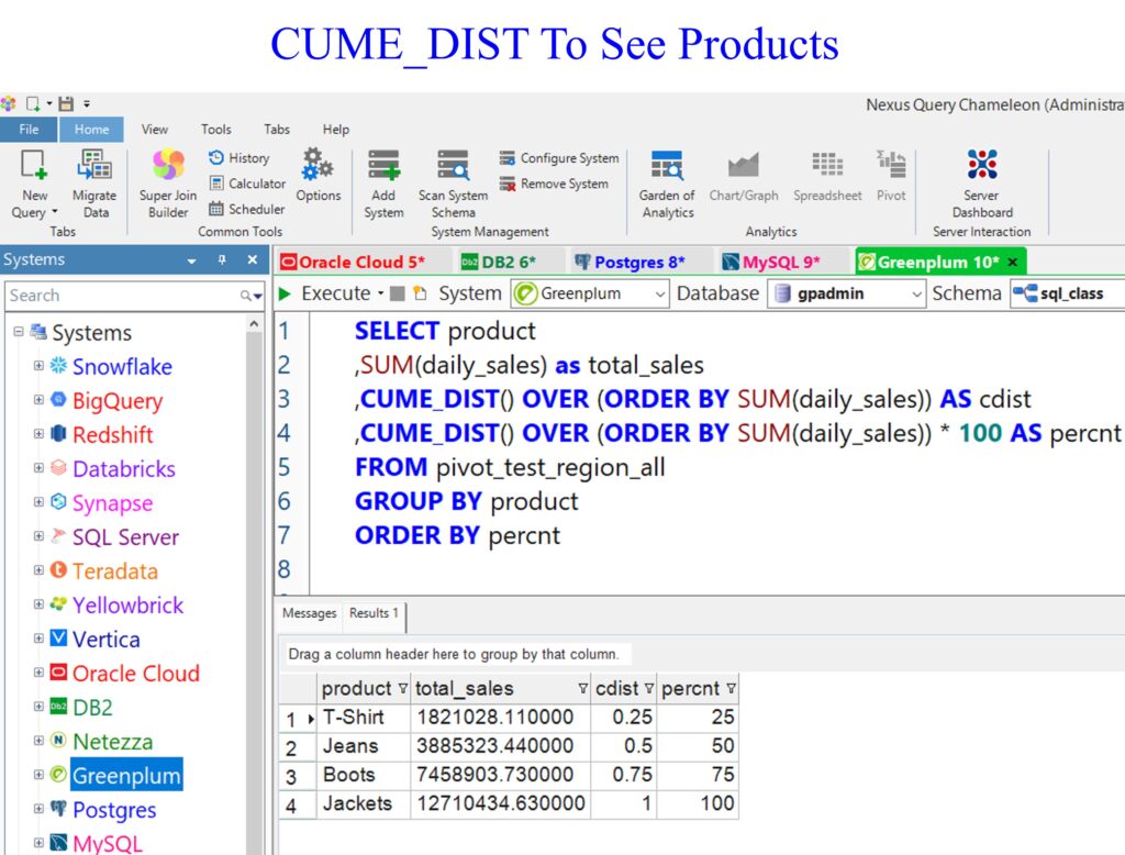 The CUME_DIST function is an SQL analytic window function that calculates the cumulative distribution of a value within a group of values. CUME_DIST provides a straightforward way of analyzing sales distribution across different products.
