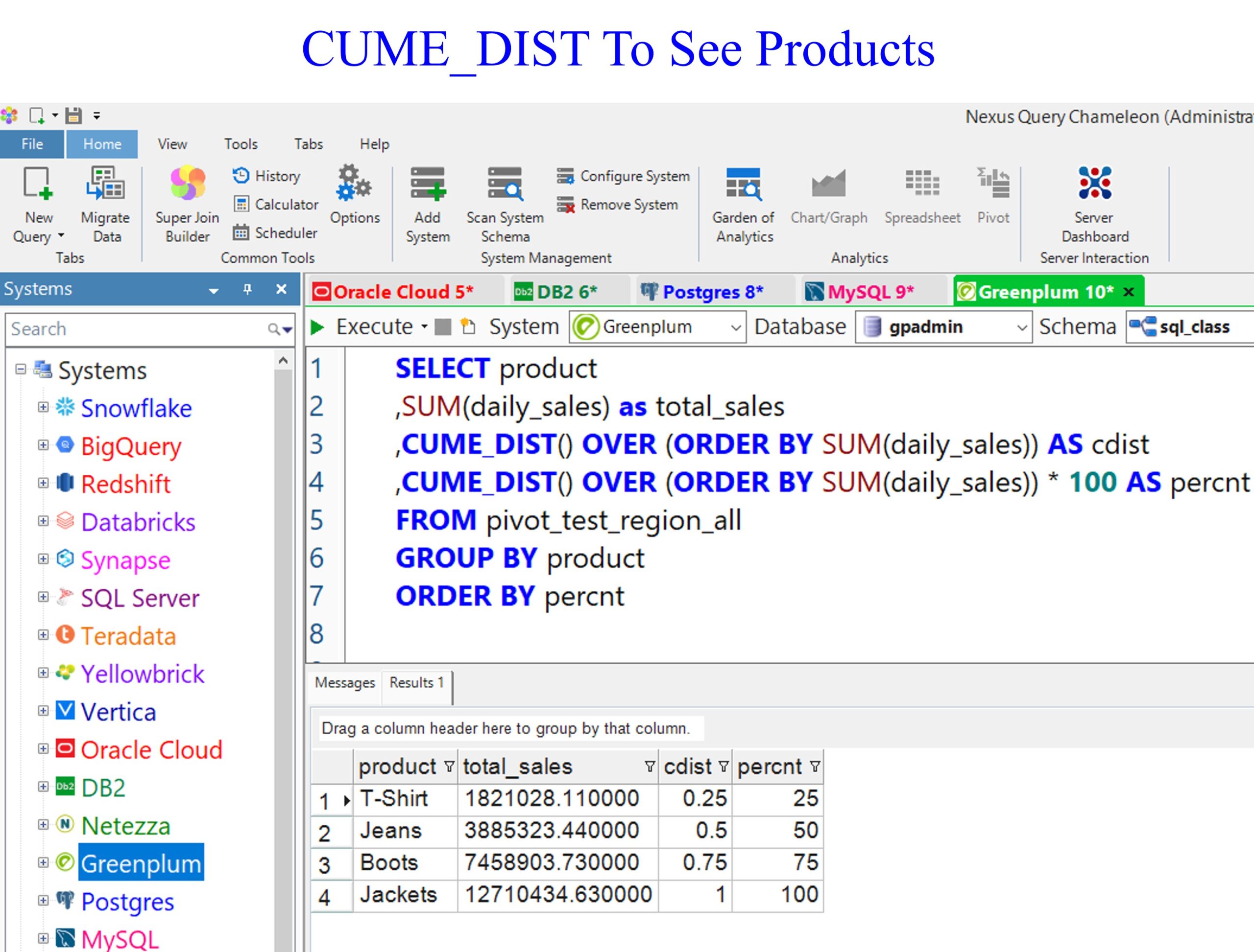 Below is a query that performs a sum of the daily_sales, which we alias total_sales. We then perform a CUME_DIST on the total_sales. Jackets are performing quite well, and T-shirts are our worst performers.