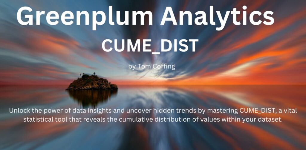 I can teach you analytics! Greenplum is built for analytics, and this week, I will show you CUME_DIST, a not-so-distant cousin to RANK. You can now unlock the power of data insights and uncover hidden trends by mastering CUME_DIST, a vital statistical tool that reveals your dataset’s cumulative distribution of values.