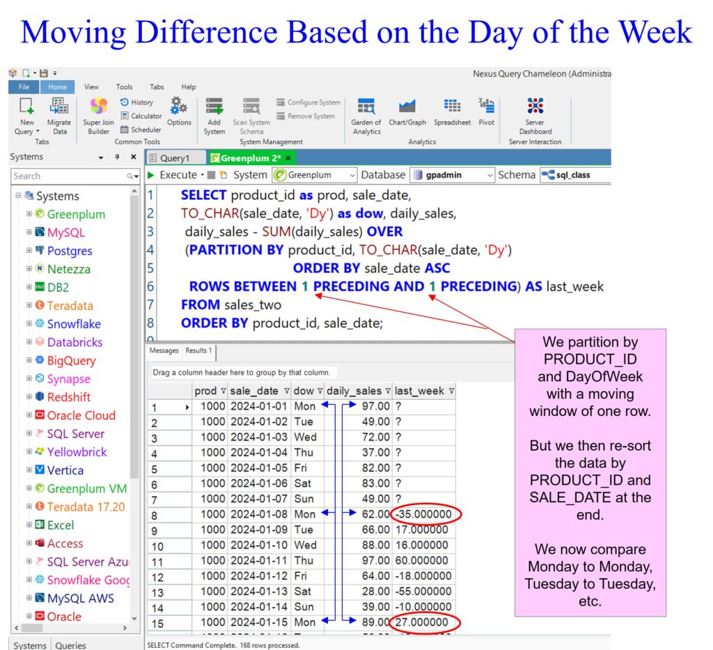 The moving difference calculation ordered the data by product_id and day of the week. The moving difference calculated Monday to the previous Monday, Tuesday to the previous Tuesday, etc. However, with the addition of the ORDER BY product_id sale_date at the end, I resorted to it to make the report look nice. However, if you compare the first Monday, we made 97.00 to the second Monday, where we made 62.00, we did worse on the second Monday by 35.00. But we did better on the second Tuesday than the first Tuesday by 17.00.