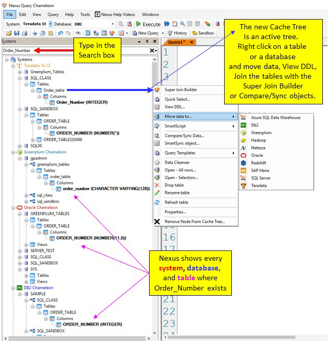 What is even more amazing is that Nexus allows the user to then right click on the table or view and take actions. A user might want to use the Nexus to move the table to another system. They might want to query the table or even bring it into the Nexus Super Join Builder so it can be joined. Users can even join tables or views from the other systems by dragging-and-dropping them into the Super Join Builder for a cross-system join. What is important here is that the Nexus Cache Tree results can be queried, moved, or joined.