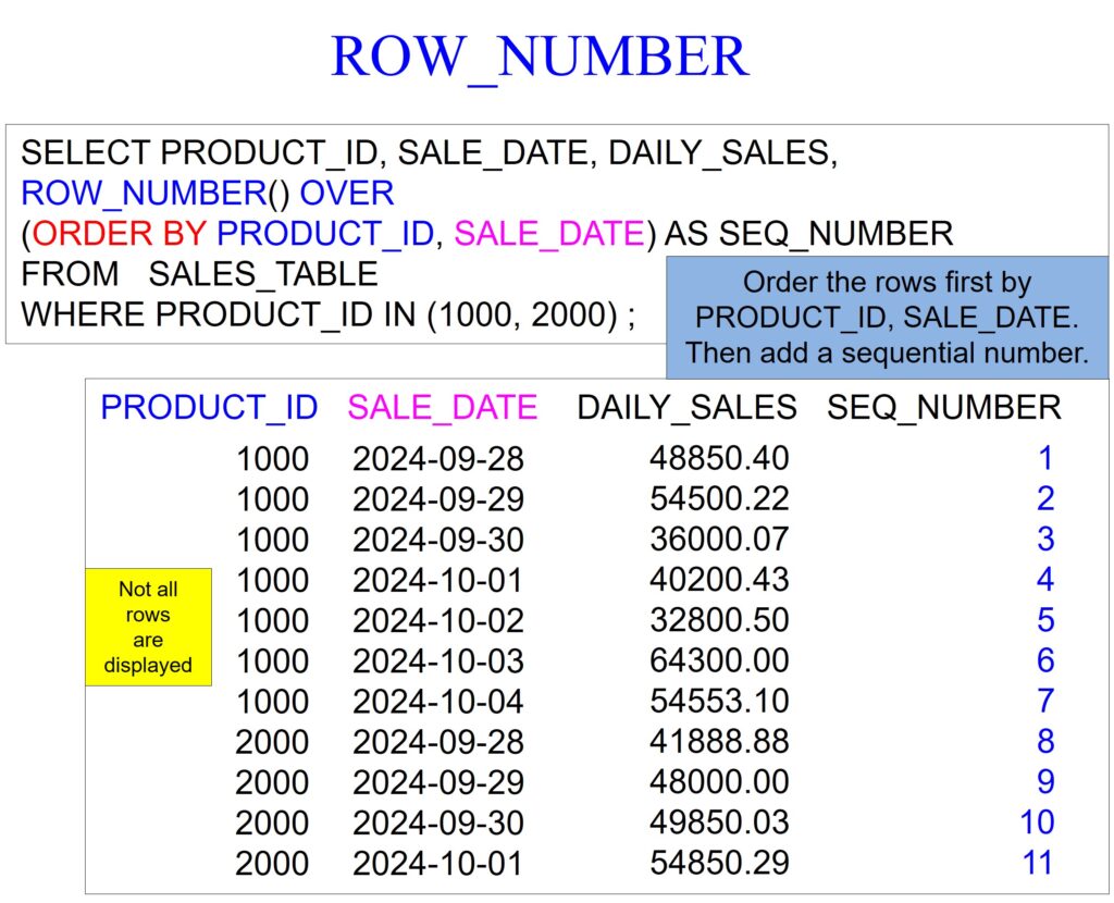 Our example below first orders the data by a major sort of product_id and then a minor sort of sale_date. Notice we see in the result set the product_id of 1000 and within 1000 sequential dates in order. Only after the data is ordered does the row_number place a number starting from one on the first row and incrementing by one until the last. These types of analytics are often referred to as ordered analytics because they order the data before the analytics runs.