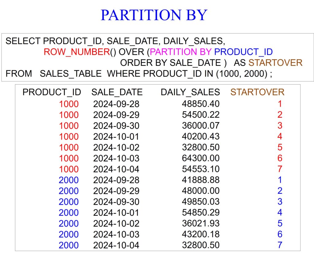 Our next example uses a PARTITION BY statement, which means performing the analytic within each product_id separately. I like to think of it as resetting the row_number with the beginning of each product_id. Notice that we are ordering the data by sale_date, but it appears we are ordering by product_id and then sale_date because of the combination of partitioning and ordering within the row_number analytic.