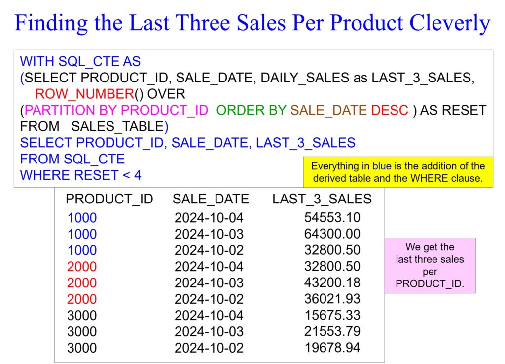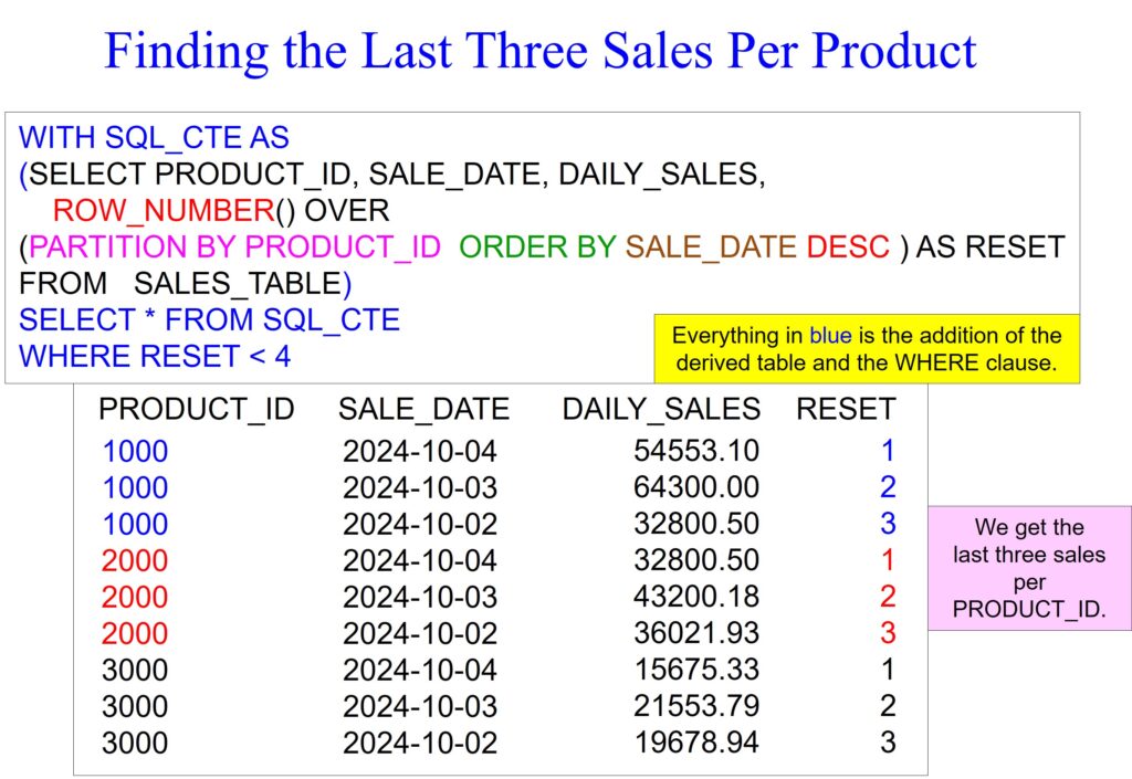 Our example returns the last three sales per product_id, demonstrating the power of a derived table. A WHERE clause filters before calculations or analytics run, so we place our query inside parenthesis to create a derived table. I have placed everything you need to create a derived table and query it with a WHERE clause in blue.