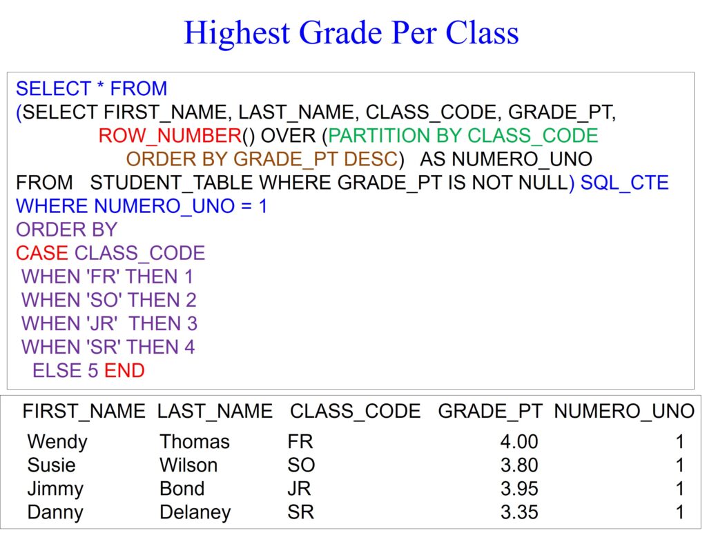 Now that you know what to look for, the example below should be easy on your brain and your eyes. We partition by the class_code and order by the grade_pt in descending order. We also use a WHERE clause to filter out grade_pt null values. We then place our row_number query inside a derived table, which I have colored in blue, often referred to as a common table expression (CTE). I have also done a final ORDER BY using a CASE statement to order the answer set logically instead of alphabetically.
