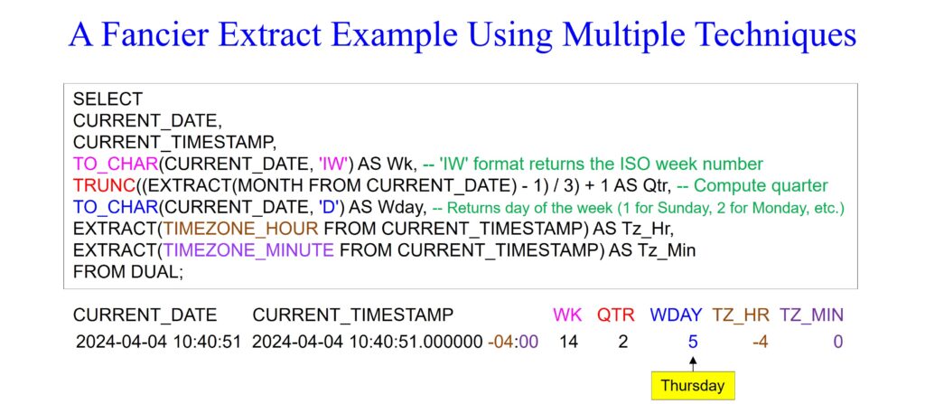 The query below uses the EXTRACT command to extract a specific component (such as year, month, day, hour, minute, second.) from a date or timestamp value. It allows users to retrieve and work with individual parts of a date or timestamp data.