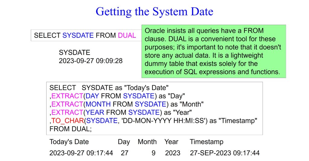 Most databases will allow you to query and receive the current date or timestamp without a FROM clause, but Oracle insists that every query use a FROM clause. So, when all you need to do is receive the CURRENT_DATE, SYSDATE, or CURRENT_TIMESTAMP, Oracle has a dummy table for dates called DUAL. As you can see from the examples below, we are receiving date and timestamp information and satisfying Oracle’s FROM clause rule by pulling the data from the dummy table DUAL.