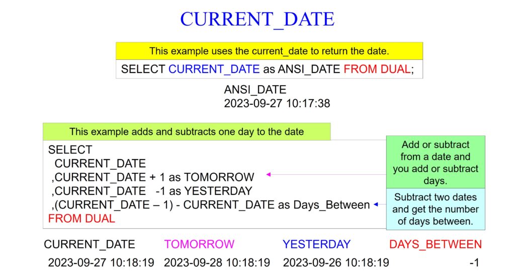 The first query in the example below retrieves the current date using the ANSI SQL standard function CURRENT_DATE and aliases it as ANSI_DATE.
