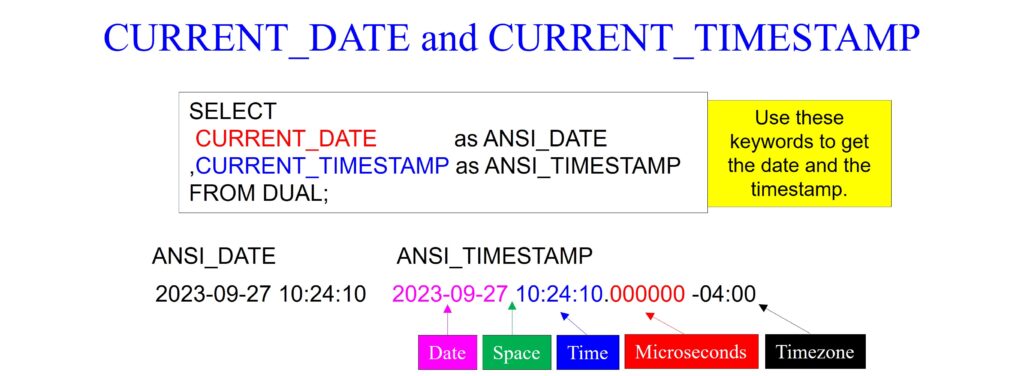 In our next example below, we see that there is not only a CURRENT_DATE and a SYSDATE but also a CURRENT_TIMESTAMP and a SYSTIMESTAMP. The CURRENT_DATE and CURRENT_TIMESTAMP return the date and timestamp without any time zone information. In contrast, SYSDATE and SYSTIMESTAMP return the date and time in the server’s time zone, attributed to the time zone offset between the client and the server where the query is executed.