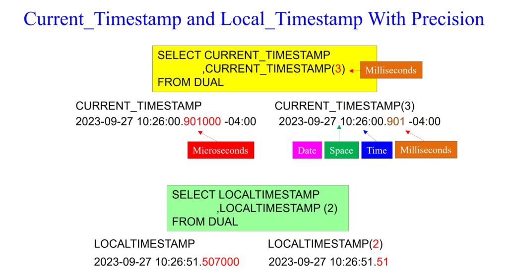 This first query retrieves the current timestamp twice. The first column fetches the current timestamp with default precision, which could vary depending on the Oracle instance settings but typically includes fractions of seconds with microsecond precision. The second column retrieves the current timestamp with a precision of 3, indicating milliseconds precision.