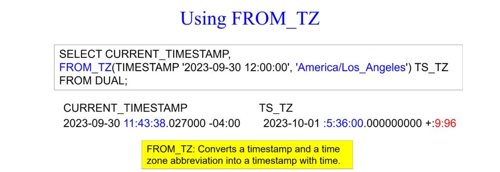 This Oracle query below retrieves the current timestamp using the CURRENT_TIMESTAMP function and generates a timestamp with time zone information using the FROM_TZ function. This query uses CURRENT_TIMESTAMP to fetch the current timestamp and FROM_TZ to generate a timestamp with specified time zone information.