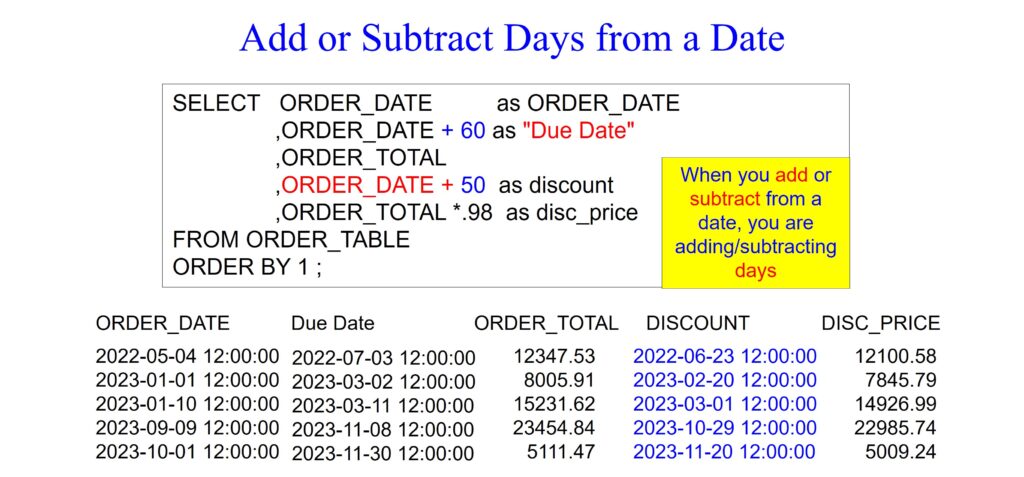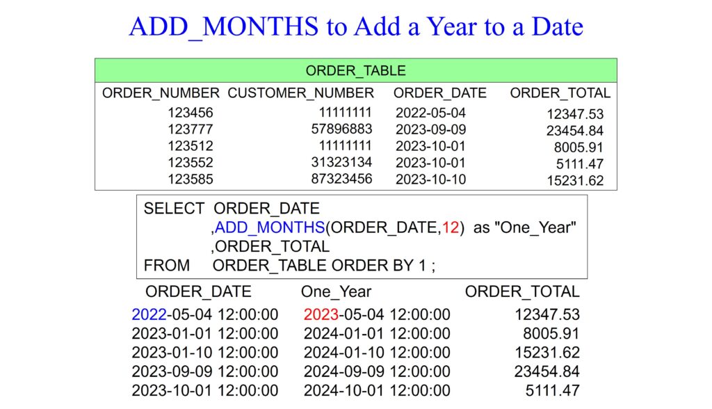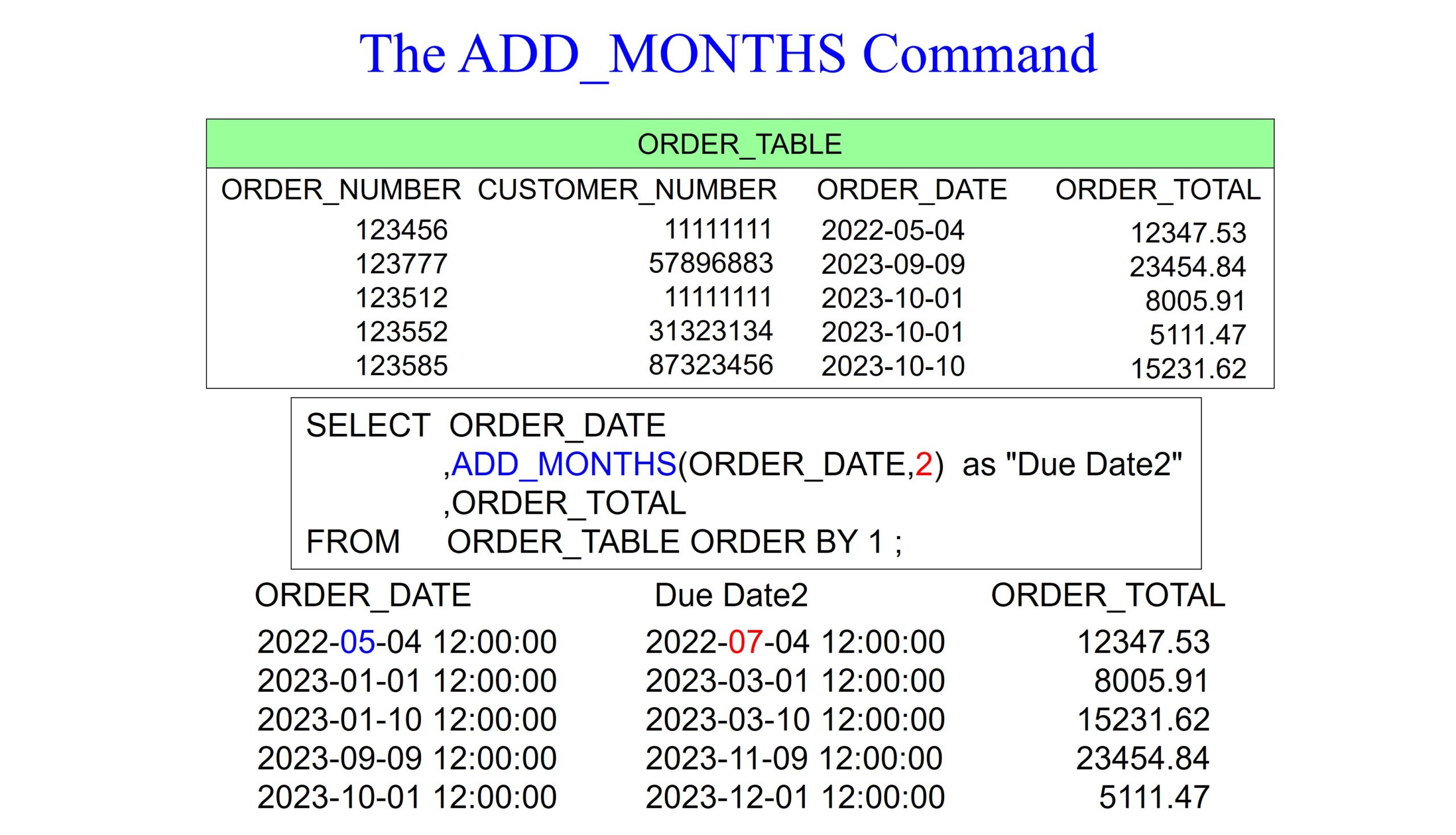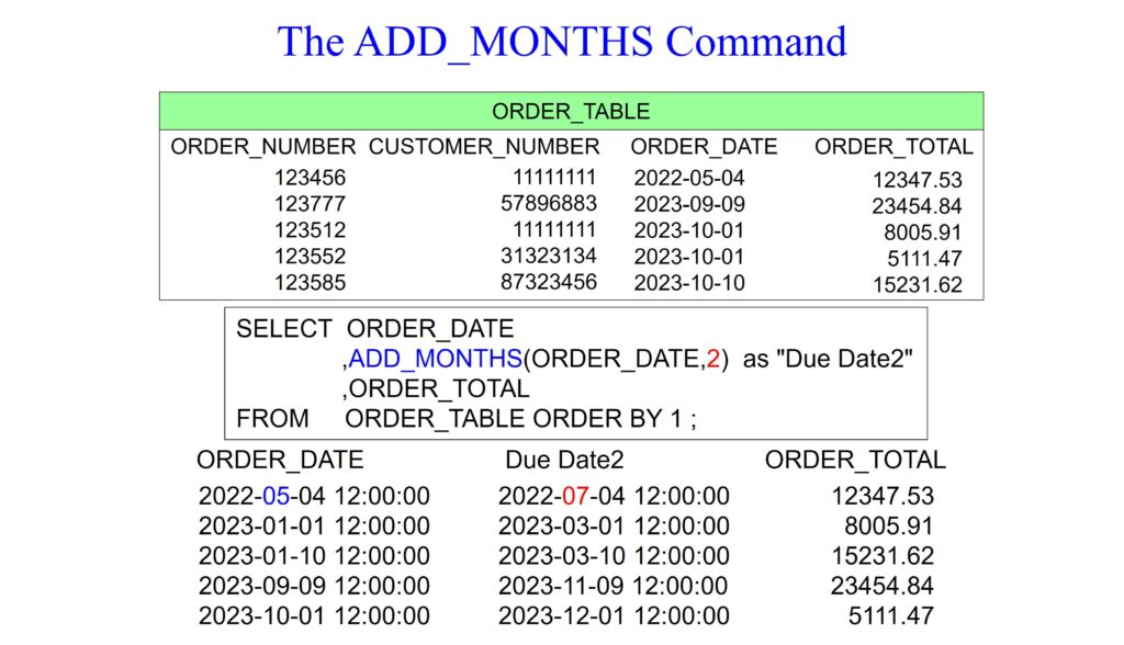 In the Oracle SQL query below, the ADD_MONTHS function calculates a new date by adding a specified number of months to the given date. Notice that we are adding two months to the ORDER_DATE. The result of this operation is aliased as “Due Date2”. The ADD_MONTHS function allows for easy manipulation of dates by adding or subtracting months, which can be useful for tasks like forecasting due dates or scheduling activities based on the order date.