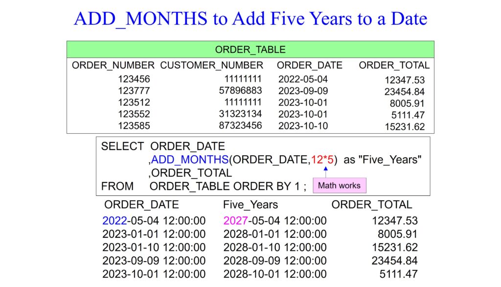 There is no ADD_YEAR command, so in the query below we use the ADD_MONTHS command using 12 months. The example that follows will show you a clever way to use the ADD_MONTHS command to add several years by performing math.