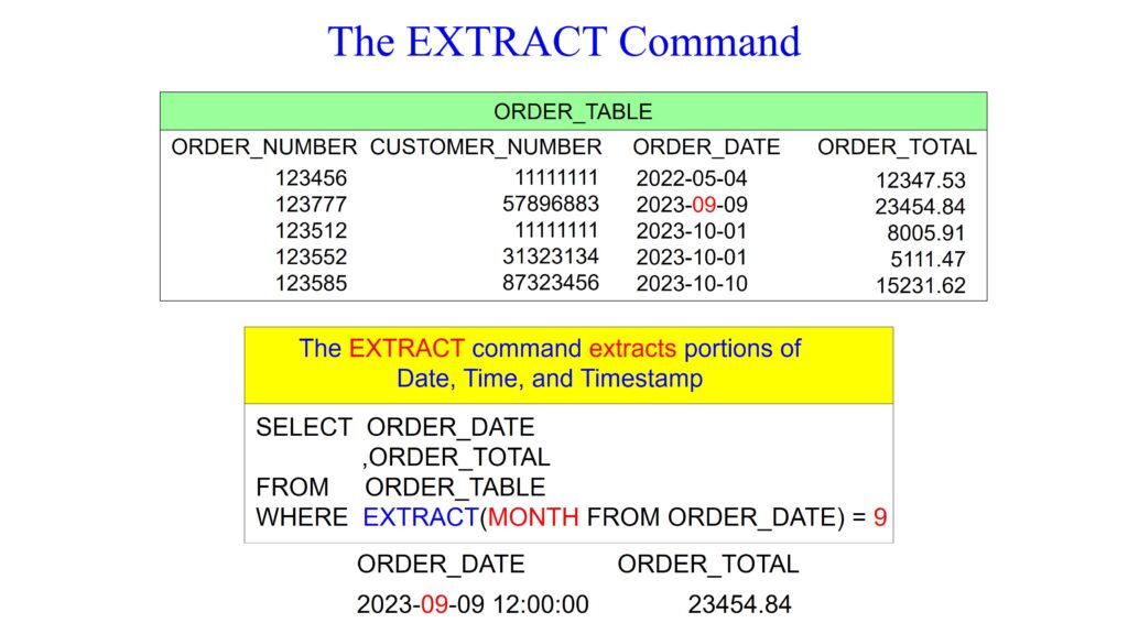 In Oracle, the EXTRACT command extracts a specific component (such as year, month, day, hour, minute, etc.) from a date or timestamp value. It allows users to retrieve and work with individual parts of a date or timestamp data. The query below retrieves orders from the ORDER_TABLE where the month of the order date is September. It utilizes the EXTRACT command to extract the month from the ORDER_DATE column and then filters the results based on that extracted month value.