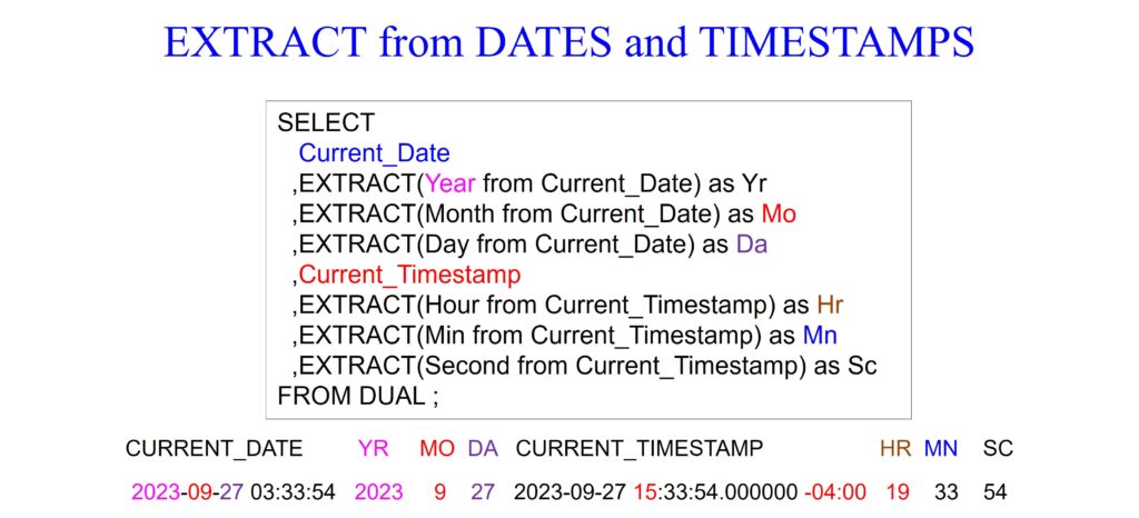 The first query in the example below retrieves the current system date and time. The second query retrieves various components of the current system date and time. It fetches today’s date, the day, month, and year components separately and presents the date and time in a specific format (‘DD-MON-YYYY HH:MI:SS’) as a timestamp.