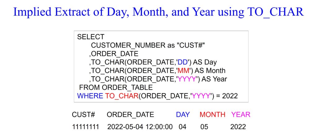 The query below retrieves data from the ORDER_TABLE, extracting and formatting the day, month, and year components from the ORDER_DATE. It also filters the results to include only orders from the year 2022. The TO_CHAR function is used as an implicit extraction tool to format the date components as required for display and filtering.